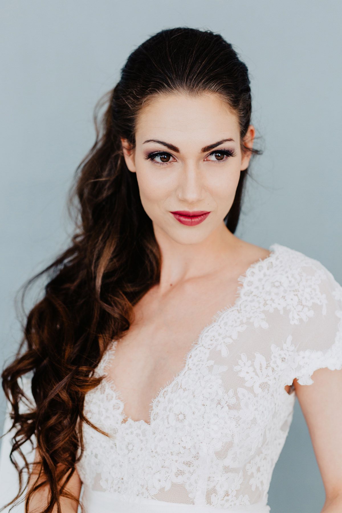 Dieser Braut Look ist das Gegenteil des vorherigen Stylings, hier dürfen die Augen dezenter geschminkt und dafür die Lippen mehr hervorgehoben werden. Greift in dem Fall also lieber zu einem dezenten Lidschatten oder setzt nur einen dünnen Lidstrich, um den Fokus auf Eure Lippen zu setzen.