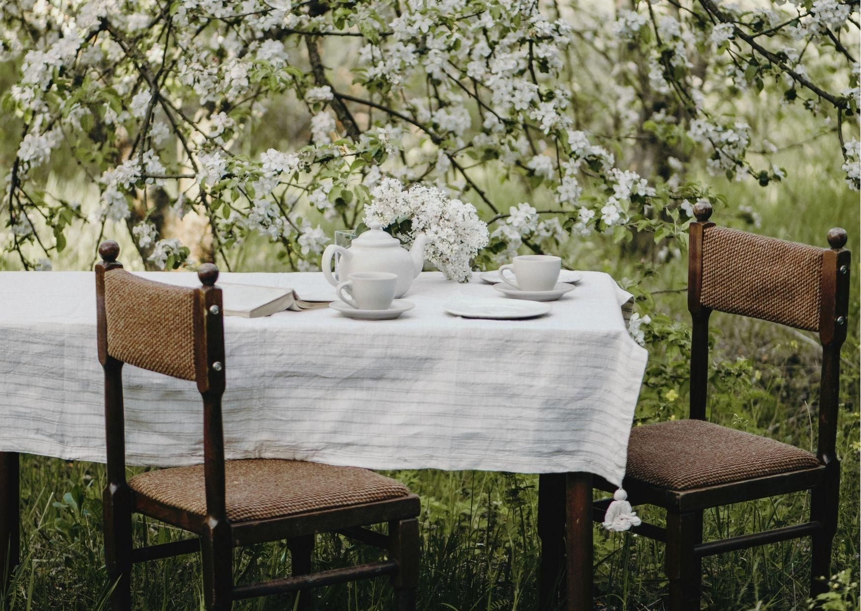 Ein Tisch und Stühle stehen in einem Obstgarten.