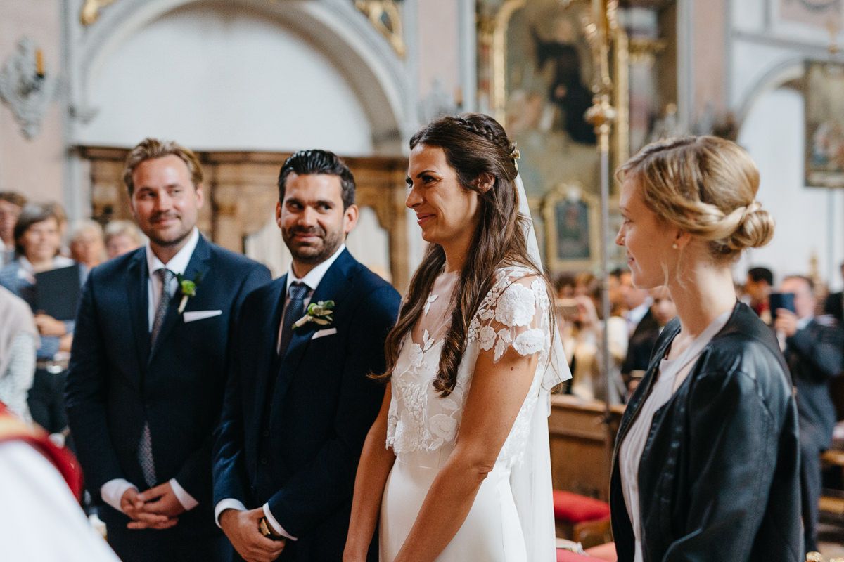 Eine Braut und ein Bräutigam schauen sich in einer Kirche an.