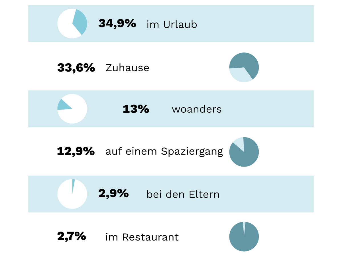Dennoch kristallisieren sich zwei top Trends heraus, die nahezu gleich oft vertreten sind. Ein Drittel macht den Antrag daheim in den eigenen vier Wänden. Ein anderes Drittel begeht den feierlichen Moment im Urlaub. Das Thema Urlaub spielt beim Heiraten also sehr wohl eine Rolle, nur eben nicht beim Finden des Partners, sondern beim Antragstellen.