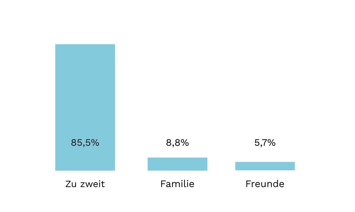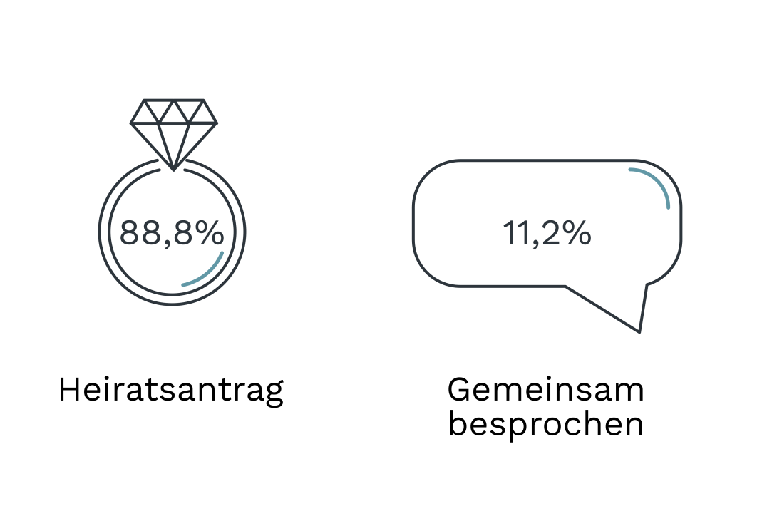 Fast schon folgerichtig aus den Antworten und Trends auf die Frage nach dem Ort des Heiratsantrags lernen wir wiederum die Antworten auf den gesellschaftlichen Rahmen bei der Verlobung zu interpretieren. Denn fast neun von zehn Brautpaaren genießen den Moment intim nur für sich, sprich zu zweit.