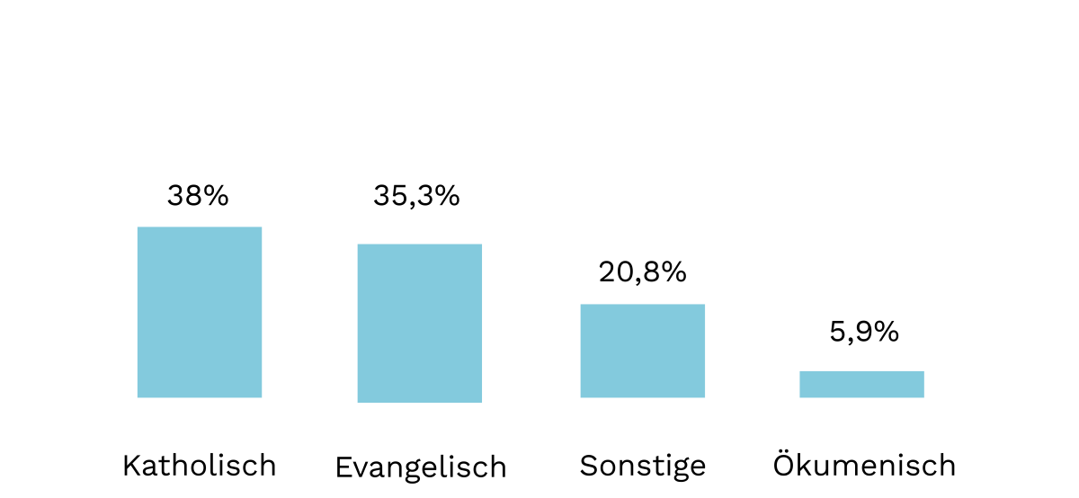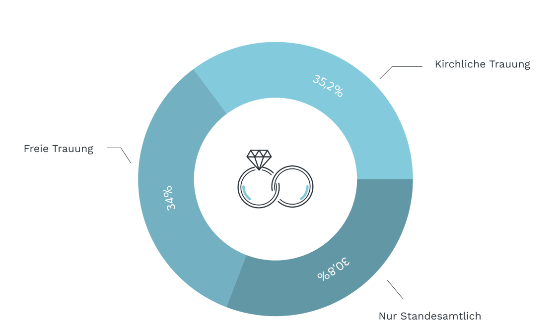 Von den deutschen Brautpaaren, die sich für eine Zeremonie entscheiden, wählen mehr als 70 Prozent eine katholische oder evangelische Trauung. Beide Konfessionen halten sich dabei in etwa die Waage. An dritter Stelle mit zusammengerechnet etwa 20 Prozent folgen die Hochzeitszeremonien aller weiteren in Deutschland praktizierten Konfessionen und Glaubensrichtungen zusammengefasst.