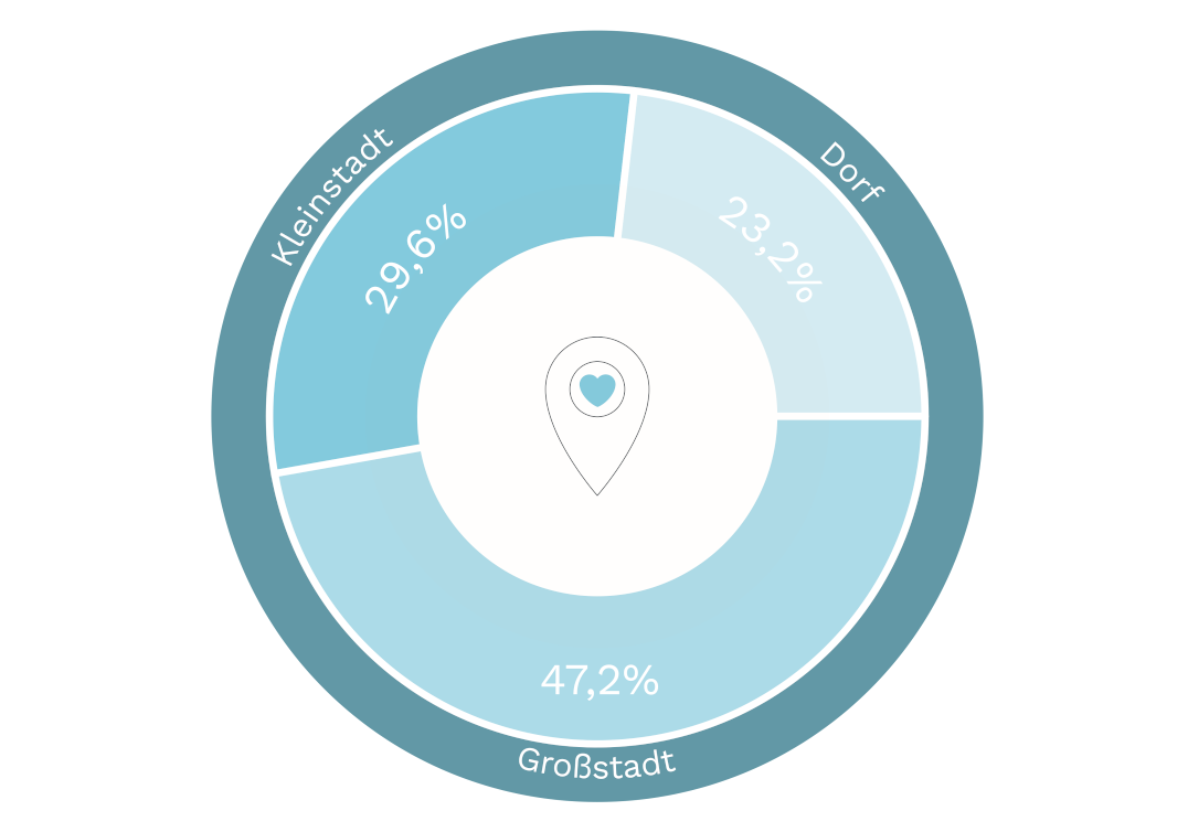 Zum Zeitpunkt der Hochzeit sind die Frauen bzw. die Bräute in Deutschland im Durchschnitt 31 Jahre jung. Die Herren der Schöpfung, die Bräutigame, sind mit 34 Jahren im Mittel leicht älter. Dass fast die Hälfte aller Befragten aus Großstädten und Metropolen mit über 100.000 Einwohnern kommt, ist insofern bemerkenswert, weil laut amtlichem Mikrozensus nach Gemeindegrößenklassen nur etwa 32 Prozent der Deutschen dort leben. Rund 54 Prozent und damit die meisten Deutschen leben in kleineren Städten und mittleren Gemeinden zwischen 5.000 und 100.000 Einwohnern.