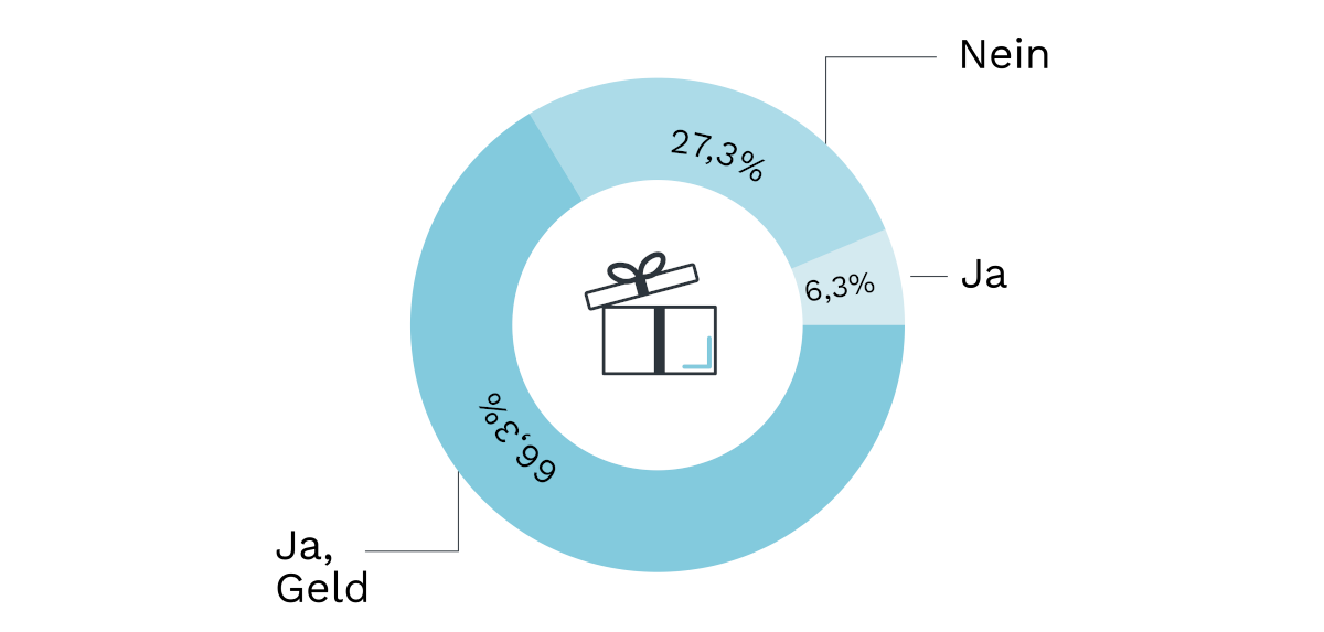 Dazu haben die Paare eine ganz klare Meinung. Fast drei Viertel haben konkrete Geschenkewünsche. Die große Mehrheit der Ja-Antworten entfällt ganz konkret auf Geldgeschenke. Vielleicht korrespondiert das direkt mit den Antworten auf die Frage, wer die Hochzeit am Ende bezahlt. Nur etwa ein Viertel äußert keine konkreten Geschenkewünsche. Und gar nur rund jedes 16. Paar gibt zwar konkrete Geschenkewünsche kund, hat dabei jedoch keine monetären Präsente im Sinn.