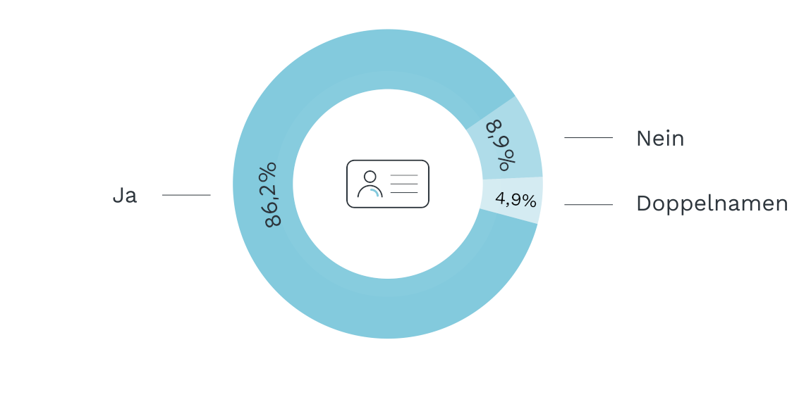 Mit 86,2 Prozent entscheiden sich fast neun von zehn Paaren und Partnern bei der Hochzeit für die Annahme eines gemeinsamen Familiennamens ohne Bindestrich. Nur fünf Prozent der Paare wählen die Variante des Doppelnamens, der immerhin ebenfalls noch ein gemeinsamer Familienname ist, nur ein neuer halt.
