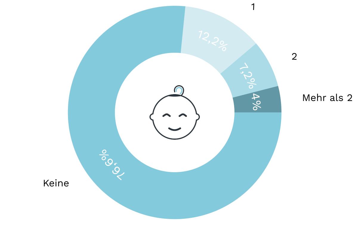 Rund 77 Prozent aller befragten Paare haben zum Zeitpunkt der Hochzeit noch keine Kinder, zumindest noch keine geborenen. Mehr als jedes zehnte Paar bringt ein Kind mit in die Ehe. Bei etwa jedem 14. Paar sind es gar zwei Kinder. Und bei jedem 25. Paar tummeln sich vor dem Altar sogar mehr als zwei Kinder, die mit in die neue Familie eingehen.