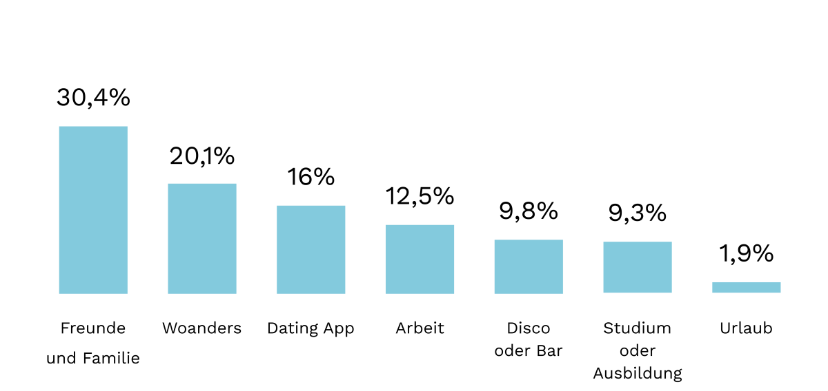 Mehr als 30 Prozent und folglich die meisten Brautpaare lernen sich über Familie oder Freunde kennen. Das ist keine Überraschung, denn dort findet häufig der Großteil des sozialen Lebens mit zugleich den wenigsten gesellschaftlichen Restriktionen beispielsweise durch Hierarchien und Normen statt. Interessanter wird es bei den Folgeplatzierungen.