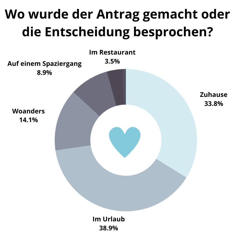 Der Ort, wo sich viele Paare auf die Ehe einschwören und häufig mit dem überreichten Verlobungsring strahlend vor Liebe das Ja gestehen, hat sich ein bisschen verändert. War es 2022 noch das eigene Heim, wo sich die meisten Liebenden den Antrag gestellt oder selbigen besprochen haben, nutzen 2023 die meisten Brautpaare den Urlaub in trauter Zweisamkeit dafür. Das entspricht immerhin einem Anstieg von +6,4 Prozent zum Vorjahr.