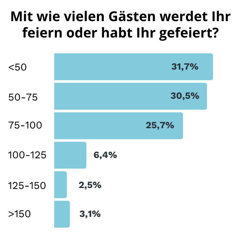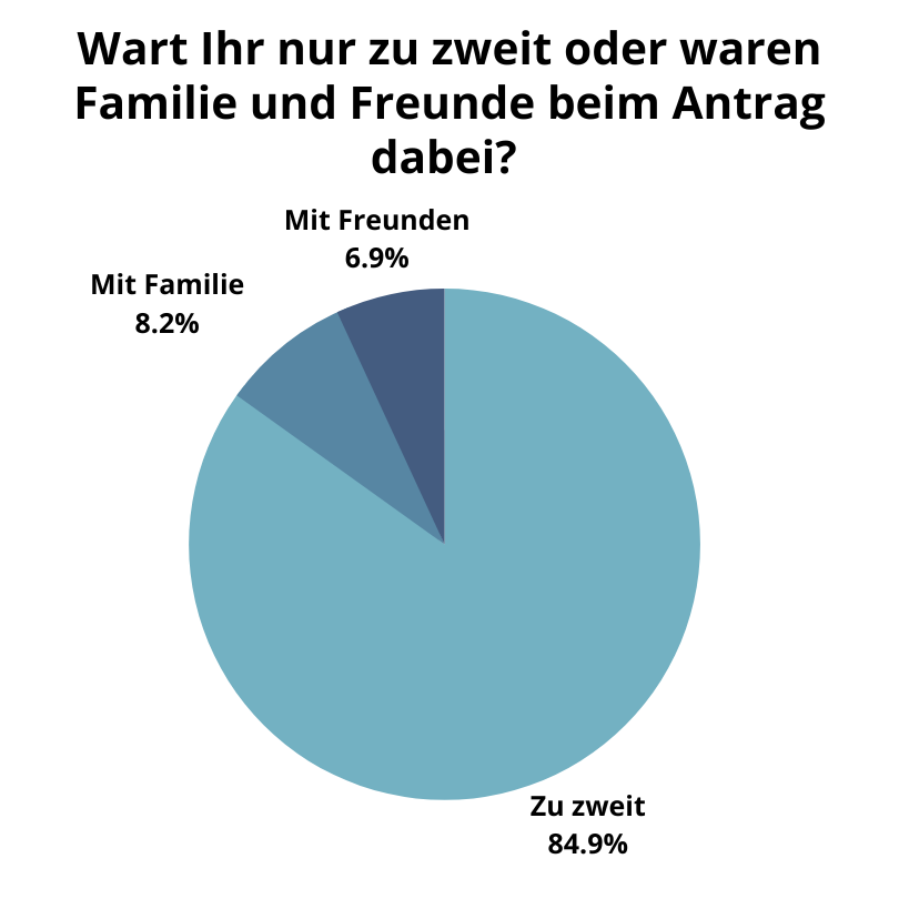 Falls überhaupt jemand dabei sein darf, dann sind das in jedem zwölften Fall die Familie und nur in einem von 14 Fällen enge Freunde. Womöglich steht diese Entwicklung auch direkt in Verbindung mit dem besinnlichen Wunsch der Brautleute nach mehr Tradition und Romantik, der sich auch an verschiedenen anderen Stellen in unserer Hochzeitsstudie 2023 ablesen lässt.