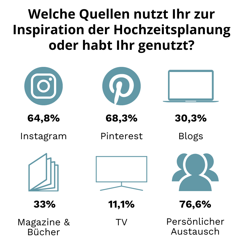 Die top Informationsquelle für Ideen zur eigenen Hochzeitsplanung ist und bleibt das Internet. Nahezu alle befragten Hochzeitspaare holen sich hier die entscheidenden Inspirationen. Soziale Netzwerke, vor allem die auf Bilder fokussierten Anbieter wie Pinterest und Instagram, sind dabei am populärsten. Die Infos aus diesen Quellen kann man dann gerne im ebenfalls beliebten direkten sozialen Umfeld diskutieren.