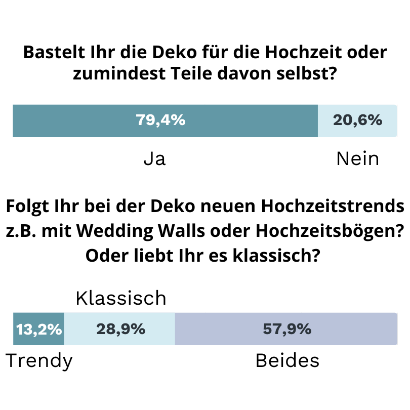 „Do-It-Yourself“ (DIY) oder schlicht einfach „selbstgemacht“ bleibt nicht nur Trend. DIY wird sogar noch trendiger. Fast 80 Prozent der Befragten geben in unserer Hochzeitsstudie 2023 an, dass sie bei der Dekoration ihrer Hochzeit selbst mit anpacken, basteln, dekorieren usw. Das sind starke +7,3 Prozent mehr als im Vorjahr. Deutschland wird also noch mehr zum Land der kreativen Selbermacher. So macht vielen das Heiraten erst richtig Spaß.