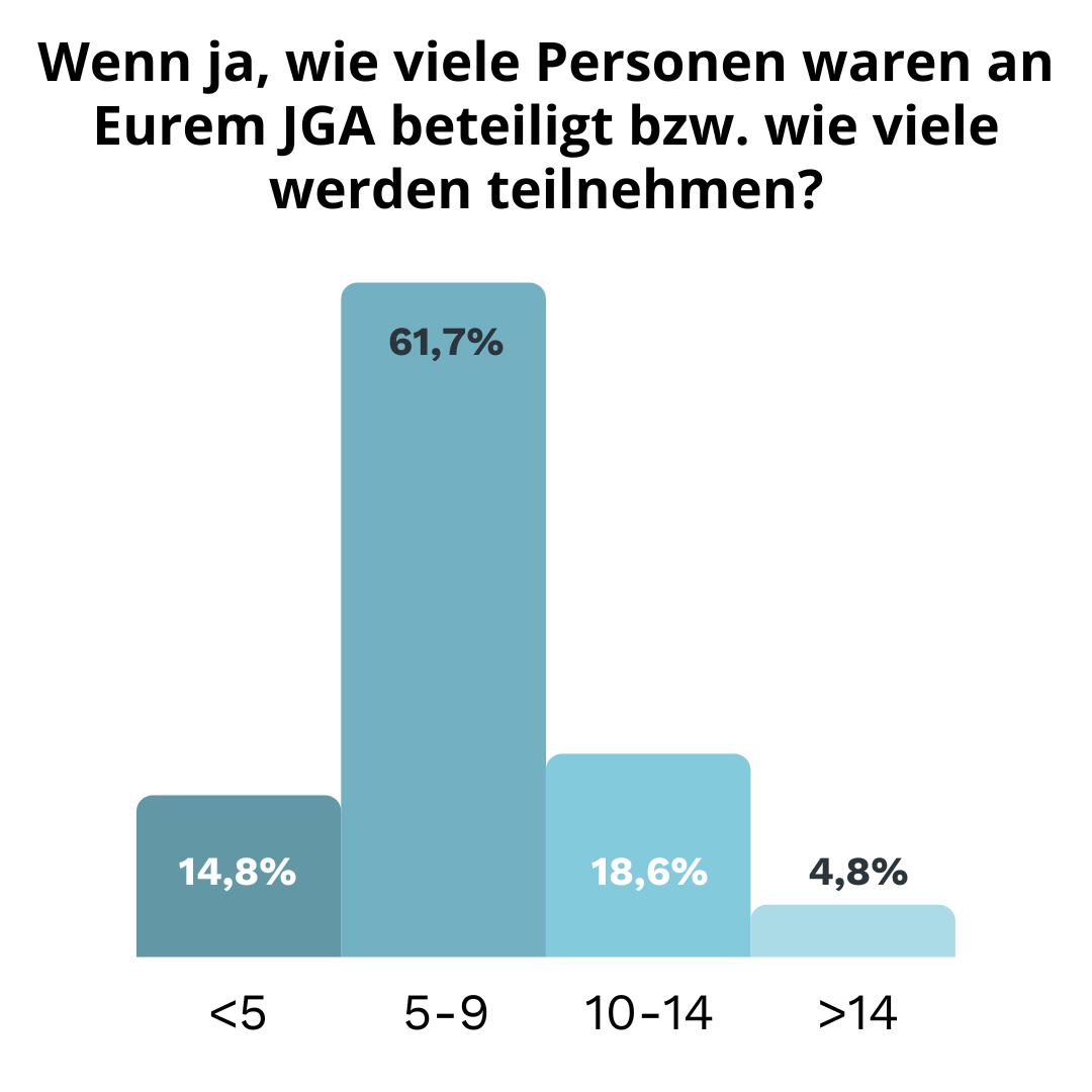 Beim Junggesellenabschied, der für gewöhnlich kurze Zeit vor der Hochzeit stattfindet und meist von Freunden oder den Trauzeugen arrangiert wird, sollen aber bitte nur die engsten Freunde dabei sein. Die Mehrheit der partywütigen Bald-Eheleute feiert den JGA gerne mit fünf bis neun Freunden. Dass es mal mehr als 14 Personen werden, bleibt höchst selten.