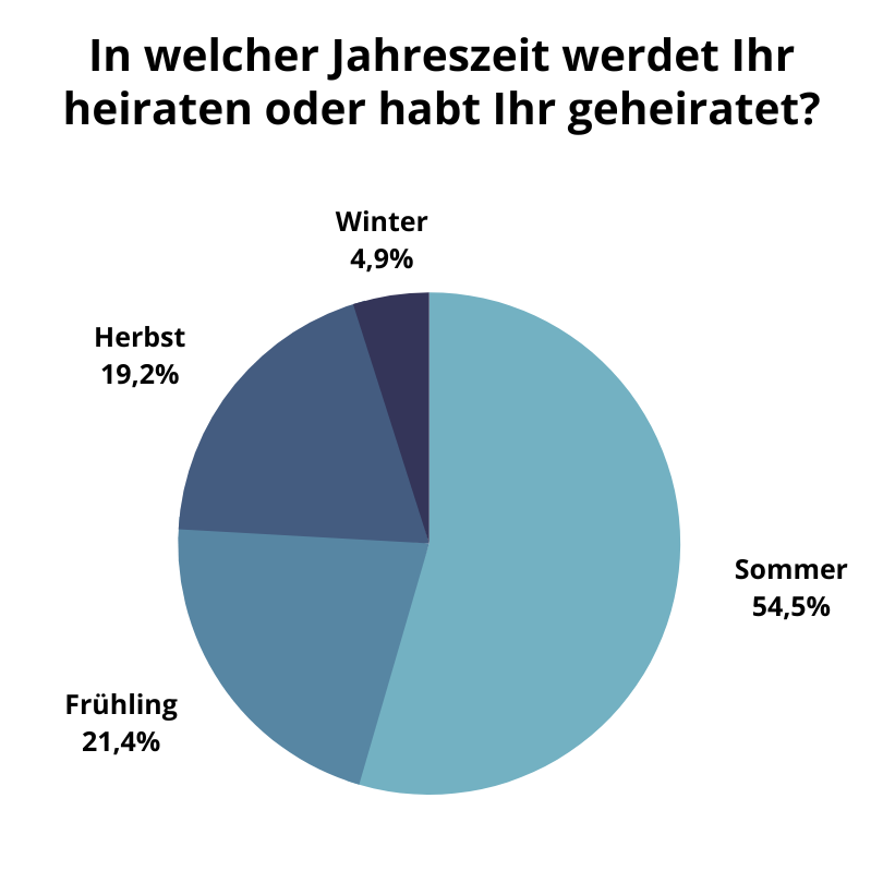 Die Anzahl der kirchlichen Hochzeiten hingegen sinkt mit 29,5 Prozent um -3,8 Prozent im Vorjahresvergleich merklich. Im Gegenzug gewinnen die freien Hochzeiten mit 36,3 Prozent um +3,1 Prozent im Vergleich zum Jahr davor signifikant hinzu. Ein gewisser Trend 2023 scheint also weg von der kirchlichen Hochzeit hin zu einer freien Trauzeremonie zu zeigen. Ursachen, woran das genau liegen könnte, kann unsere Hochzeitsstudie 2023 leider nicht genau herleiten oder valide mutmaßen.