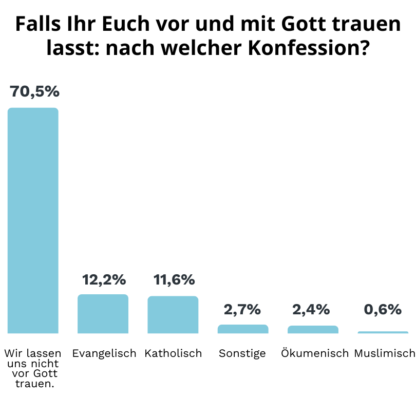 Der aktuelle Trend zur Abwendung von der kirchlichen Hochzeit zeigt sich auch bei diesem Fragekomplex. Mit 70,5 Prozent entscheiden sich 2023 sehr viele Brautpaare mehr als noch vor Jahresfrist, nämlich bemerkenswerte +14,2 Prozent mehr, für eine Trauung ohne göttlichen Segen. Von den 29,5 Prozent der befragten Paare, die sich zusätzlich für eine religiöse Zeremonie entscheiden, wählen die meisten eine evangelische oder katholische Feier.