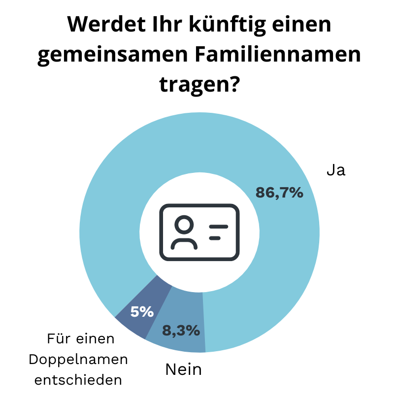 Die Beliebtheit von Doppelnamen nimmt aus statistischer Sicht also auf niedrigem Niveau weiter ab. An Beliebtheit gewinnen kann auf niedrigem Niveau hingegen das Beibehalten der alten Namen. Immerhin 8,3 Prozent der Partner*innen wollen ihre bisherigen Namen nun trotz Heirat weiterhin tragen. Dafür entscheiden sich +2,8 Prozent mehr als noch 2022. Bei den Familiennamen trotz Hochzeit alles beim Alten zu belassen, das scheint 2023 ein neuer kleiner Trend zu sein.