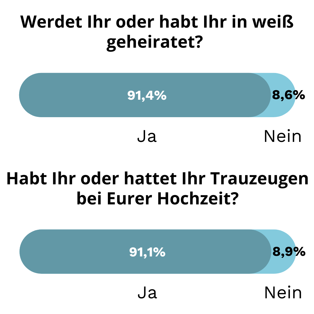 Auf den ersten Teil der Frage bleibt die glasklare Antwort: Ja! Mehr als neun von zehn Paaren heiraten in Weiß. Diese Tradition behauptet sich hartnäckig. Das weiße Brautkleid der Dame ist und bleibt ein Muss am Hochzeitstag. Ähnlich fest verankert scheint sich auch die Tradition der Trauzeugen fortzusetzen.