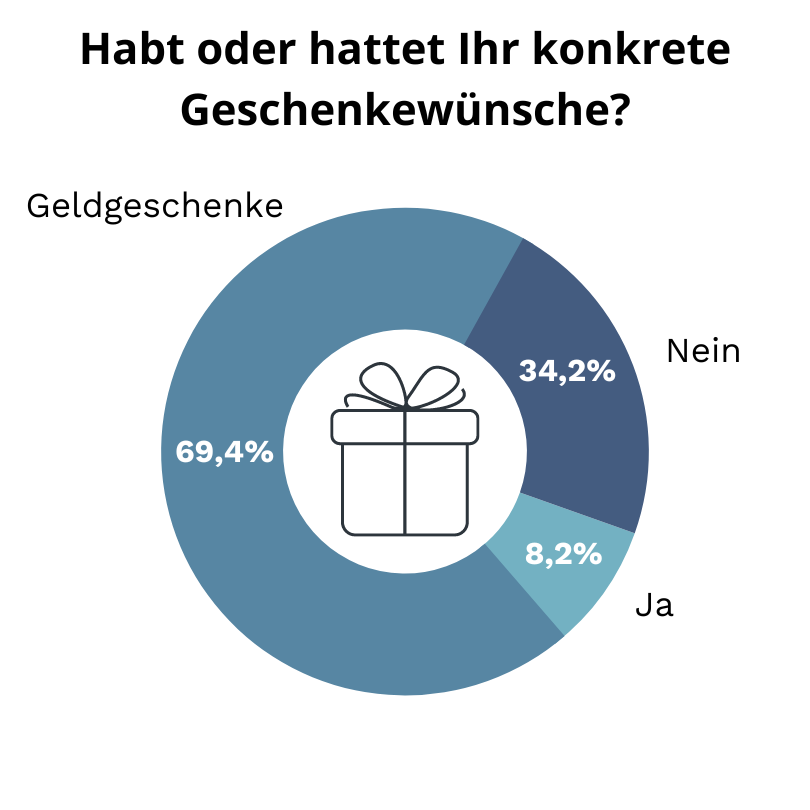 Dazu haben die befragten Paare eine klare Meinung. Fast 80 Prozent haben konkrete Geschenkewünsche. Die große Mehrheit der Ja-Antworten entfällt dabei mit 69,4 Prozent auf die Geldgeschenke. Irgendwer muss die Hochzeit ja letztlich bezahlen und das tun die meisten Hochzeitspaare schließlich selbst. Nur etwa jedes fünfte Brautpaar äußert gar keine konkreten Geschenkewünsche.