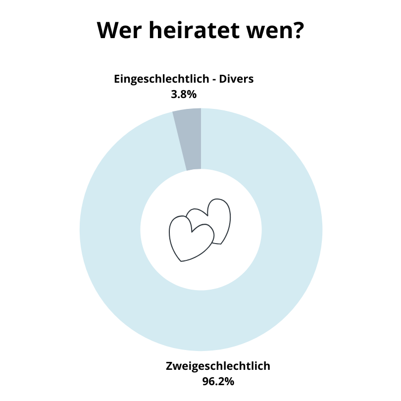 Die große Mehrheit bilden jedoch nach wie vor die zweigeschlechtlichen Ehen. Exakt 96,2 Prozent der Paare heiraten heterosexuell. Doch immerhin schon 3,8 Prozent der Turteltauben geben sich eingeschlechtlich oder divers das Ja-Wort. Die Freiheiten für alle, die aus persönlichen Gründen einen anderen Lebensweg abseits der klassischen Rollenbilder wählen, scheinen zu wachsen.