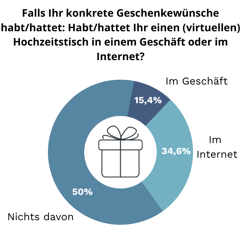 Von denen, die konkrete Geschenkewünsche äußern und dabei nicht auf Geldgeschenke aus sind (8,2 Prozent), legen viele einen sog. „Hochzeitstisch“ an. Der Brauch wurde in den 1920er Jahren in Chicago erfunden und erfreut sich bis heute einer gewissen Beliebtheit. Wenn es ein Geschenketisch sein soll, dann zumeist ein privater oder einer im Internet. Das Online-Angebot stammt in der Regel von Kaufhäusern, spezialisierten Einzelhändlern und Webseiten, die dafür sorgen, dass es zur Hochzeit kein Geschenk doppelt gibt.