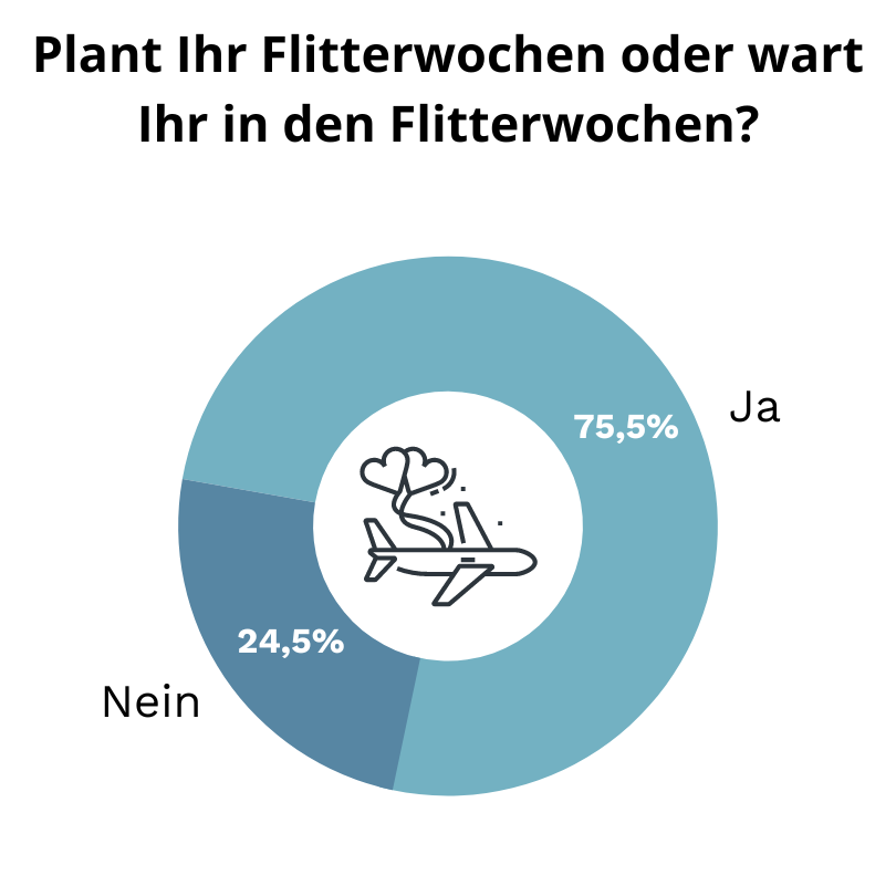 Der Trend zum Flittern wächst auf hohem Niveau. Im Vergleich zu den Vorjahren wollen sogar noch mehr Brautpaare nach der Hochzeit in die Flitterwochen düsen. Das meinen zumindest +2,1 Prozent mehr als im Vorjahr. Mehr als drei Viertel aller Brautpaare starten 2023 direkt oder nahe dem Hochzeitstag in die gemeinsamen Flitterwochen.
