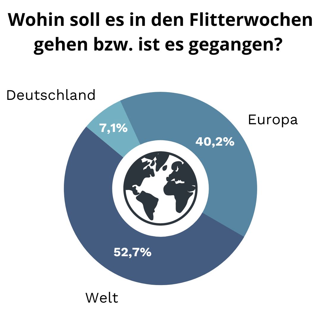 Apropos beliebte Reiseziele für frisch Vermählte: Nur jedes 14. Brautpaar hält es beim Flittern in Deutschland. Die allermeisten Brautpaare wollen lieber die große weite Welt erkunden. Vier von zehn Paaren verschlägt es beim Flittern immerhin noch nach Europa. Mehr als jedes zweite Paar verreist sogar global. Einmal im Leben die ganz große Reise zu zweit unternehmen, noch bevor die Kinder alles verändern und der Alltag wieder einkehrt.