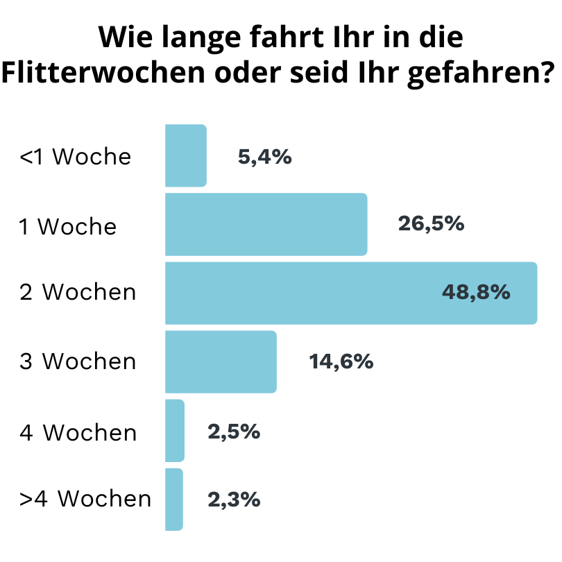 Die Flitterwochen sind für viele Paare der Traumurlaub schlechthin! Das unterstreichen die Zahlen unserer Hochzeitsstudie 2023 nachdrücklich. Diese Reise des Lebens darf dann gerne knapp zwei Wochen oder genau 13,4 Tage im Durchschnitt dauern. Für den zweiwöchigen Flitterurlaub entscheiden sich folglich auch die meisten Paare. Vier Wochen oder länger verreist hingegen nur jedes 21. Brautpaar.