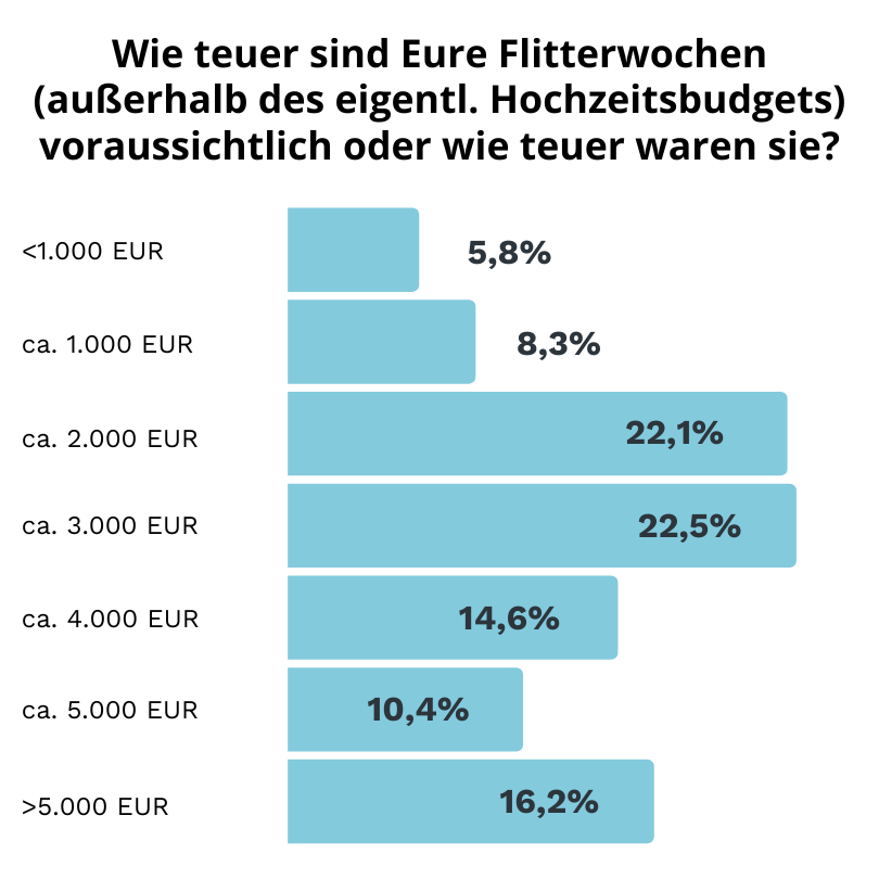 Die meisten Brautpaare, also genauer gesagt sechs von zehn Paaren, geben zwischen 2.000 und 4.000 Euro für ihre Flitterwochen aus. Wie auch die bereits thematisierte Hochzeitsfeier bezahlen sie diesen Urlaub in der Regel sofort von den Geldgeschenken, die sie bei der Hochzeit erhalten haben.