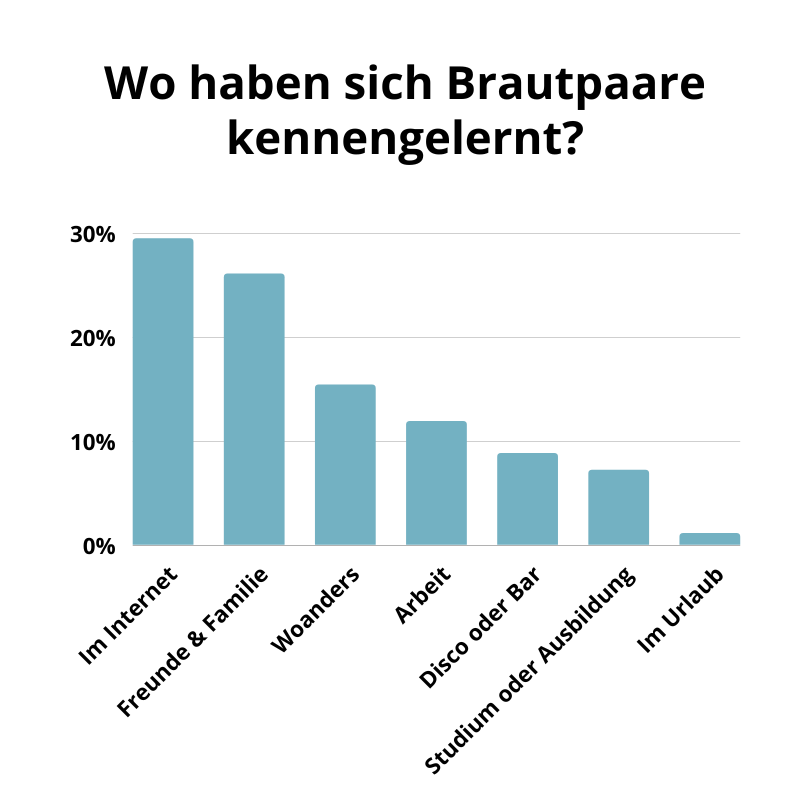 Eine spürbare Veränderung in unserer Hochzeitsstudie macht sich ebenfalls beim Kennenlernen bemerkbar. Mehr als ein Viertel der Brautpaare lernt sich zwar wie gewohnt über Freunde oder Familie kennen. Dieser Trend zeigt mit -1,8 Prozent zum Vorjahr jedoch eine abnehmende Tendenz. Das digitale Leben im Internet hat das klassische analoge Kennenlernen im Verbund von Freunden, Bekannten und Familie inzwischen deutlich überholt.