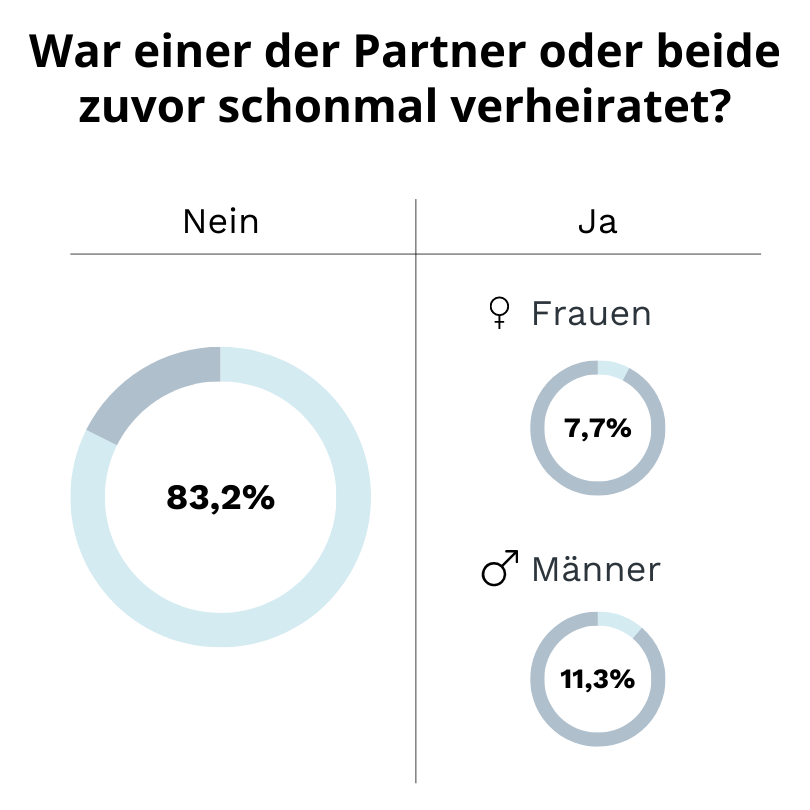 Rund 83 Prozent der befragten Paare antworteten, dass die Hochzeit für beide Partner das erste Mal sei. Das Narrativ von der ewigen Bindung, also der Wunsch „bis dass der Tod euch scheidet“, bleibt stark anerkannt in der Gesellschaft. Ein bisschen mehr Mut zum zweiten Versuch ist dennoch festzustellen. Im Vorjahr traten immerhin noch rund zwei Prozent mehr Ersttäter*innen vor den Traualtar. Im Vergleich zu 2021 sinkt die Ersttäter-Quote sogar um -5 Prozent.