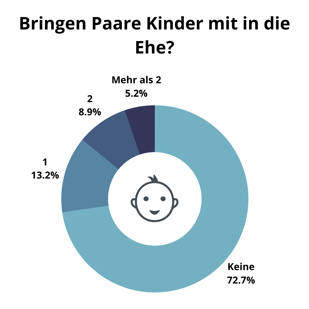 Der Trend, es nach dem Scheitern der ersten oder zweiten Ehe noch ein weiteres Mal mit einer neuen Partnerin oder einem neuen Partner zu versuchen, macht sich auch beim Punkt der in die neue Ehe mit eingebrachten Kinder bemerkbar. 72,7 Prozent aller befragten Paare haben zum Zeitpunkt der Hochzeit 2023 zwar noch keine Kinder, zumindest noch keine geborenen. Gleiches meinten im Jahr zuvor allerdings noch 75 Prozent.