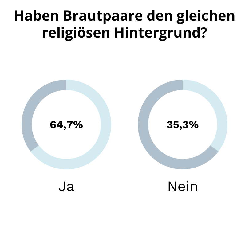 Gleich und gleich gesellt sich gern, wie wir es vom gleichnamigen Sprichwort her kennen. Das trifft an dieser Stelle zu und das bleibt auch so. Das zeigt die Hochzeitsstudie 2023 erneut relativ deutlich. Ähnlich wie im Vorjahr finden etwa zwei Drittel aller befragten Paare ihre Partnerin oder ihren Partner innerhalb ihrer Glaubensgemeinschaft oder besitzen (zusagend oder ablehnend) zumindest den gleichen religiösen Hintergrund.