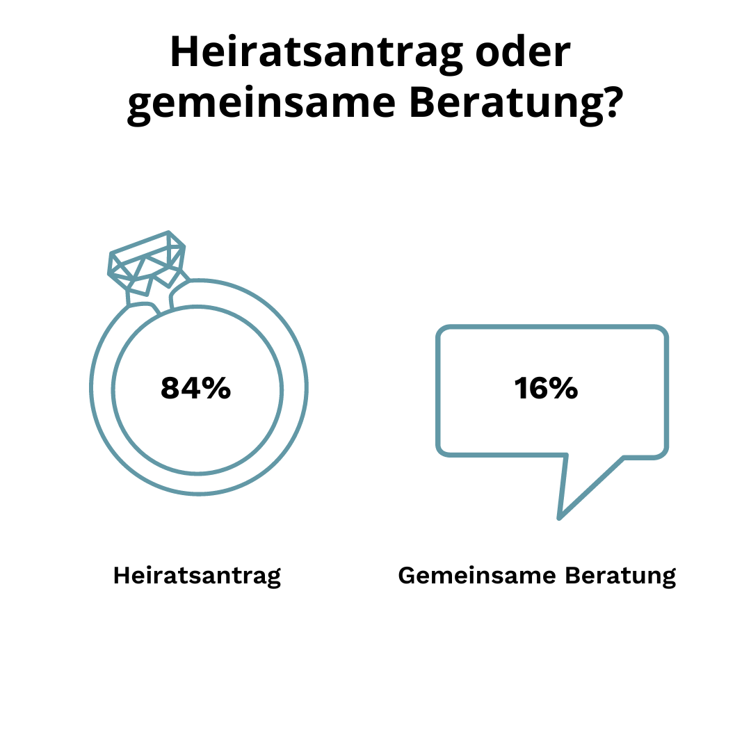 Die Quote der Frauen, die diesen Schritt wagen, ist in unserer Hochzeitsstudie 2023 mit -0,8 Prozent sogar leicht rückläufig. Der Anteil der mutigen heiratswilligen Damen in Deutschland, die auch den Mut zur Initiative haben, nimmt also wieder leicht ab. Weiterhin nehmen weniger als zwei von zehn Bräuten diesbezüglich das Heft des Handelns gerne selbst in die Hand.