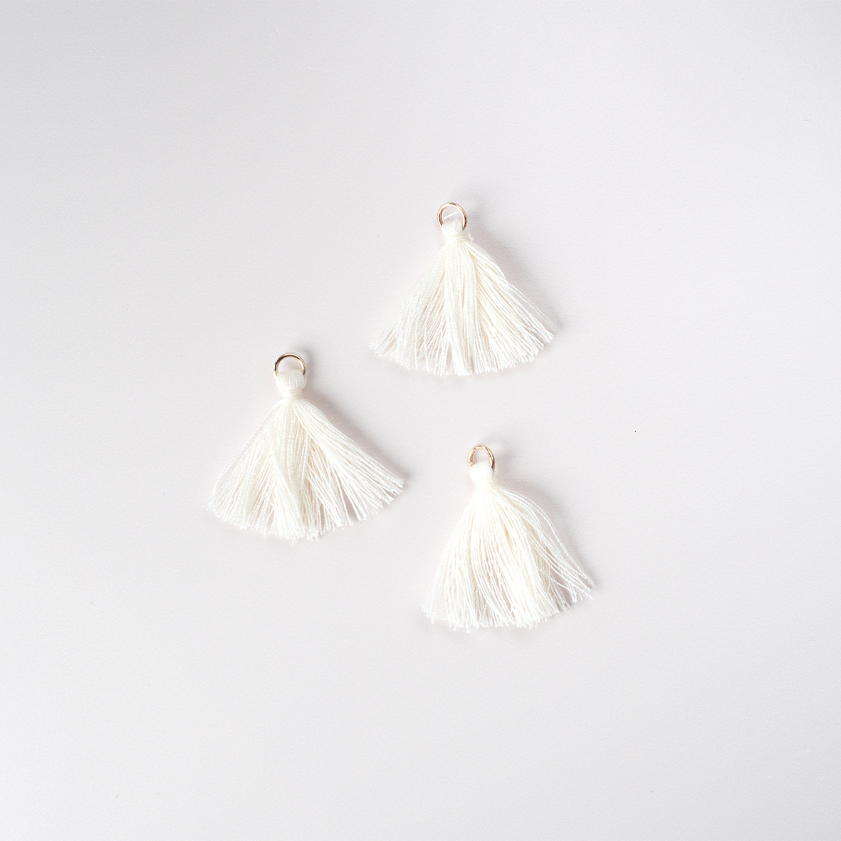 Crèmekleurige tassels (25 stuks) met een klein gouden ringetje. Bevestig deze met een splitpen of koordje aan de kaart.