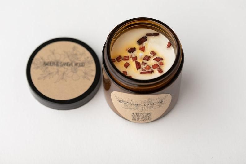 - Eine Duftkerze, die mit Bernsteinen geschmückt ist