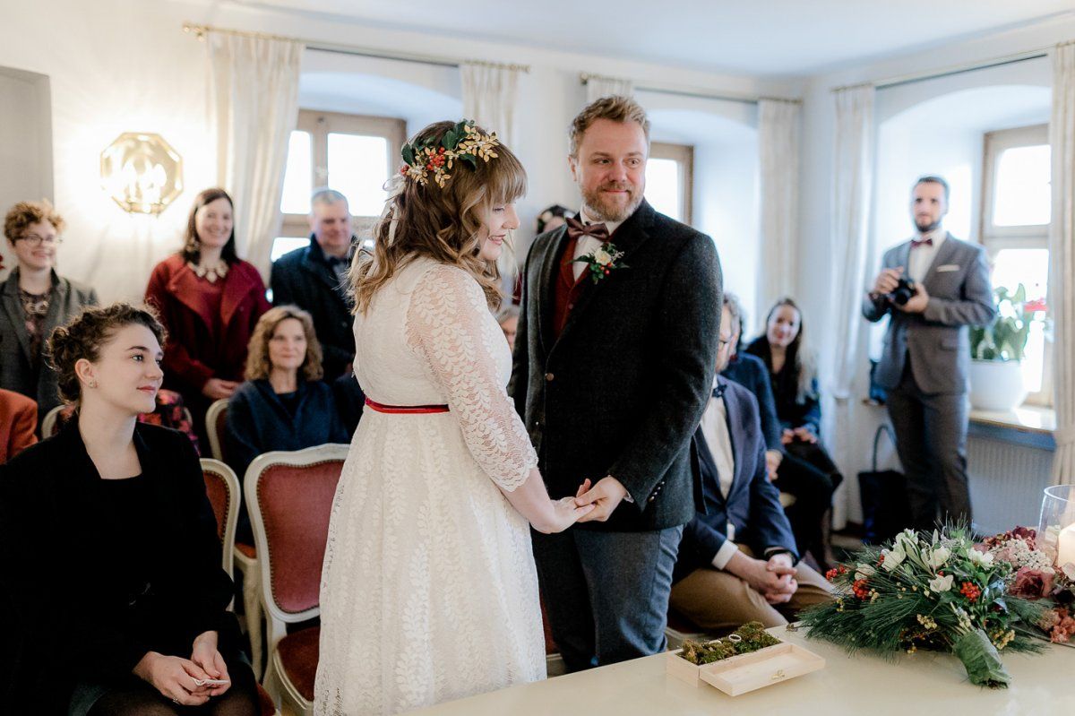 In der Regel fragt Euch der Standesbeamte im Laufe der Vorbereitung der Trauung neben den klassischen bürokratischen Geschichten stets nach drei Dingen: Wünscht Ihr Trauzeugen zur Hochzeit und wer sind diese? Welcher Name soll später der Eure sein? Wollt Ihr den Tausch der Ringe im Standesamt vornehmen oder lieber später bei einer kirchlichen oder freien Zeremonie? Klärt diese Themen vorher miteinander!