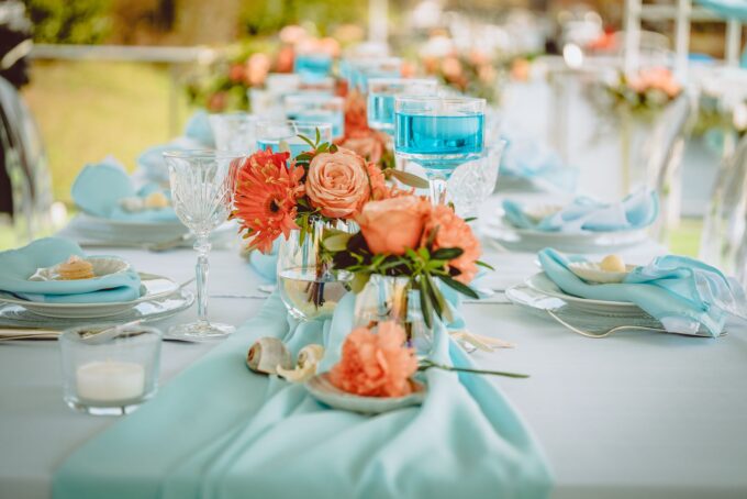 Die bezaubernde Tischedeko ist in den Farben türkis und korall gehalten. Seesterne und Muscheln, werden in Szene gesetzt. Elegante Kerzenhalter sind mit türkisfarbener Flüssigkeit befüllt, sie verleihen einen zarten Touch und harmonieren perfekt mit der übrigen türkisen Dekoration. Die korallfarbenen Blumen aus dem Brautstrauß dekorieren ebenso die Tafel. Wir finden ein total eleganter und farblich abgestimmter Brauttisch!