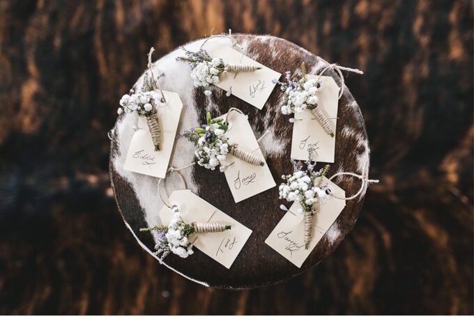 Eine andere Idee ist es, die Namenskarten nach dem Drucken oder Beschriften an einen kleinen Strauß aus Trockenblumen zu binden. Hierfür eignet sich je nach Farbkonzept zum Beispiel Lavendel, Eukalyptus oder ein kleiner Wiesenstrauß. Eine wunderschöne Option zum Beispiel für eine Boho - Hochzeit.