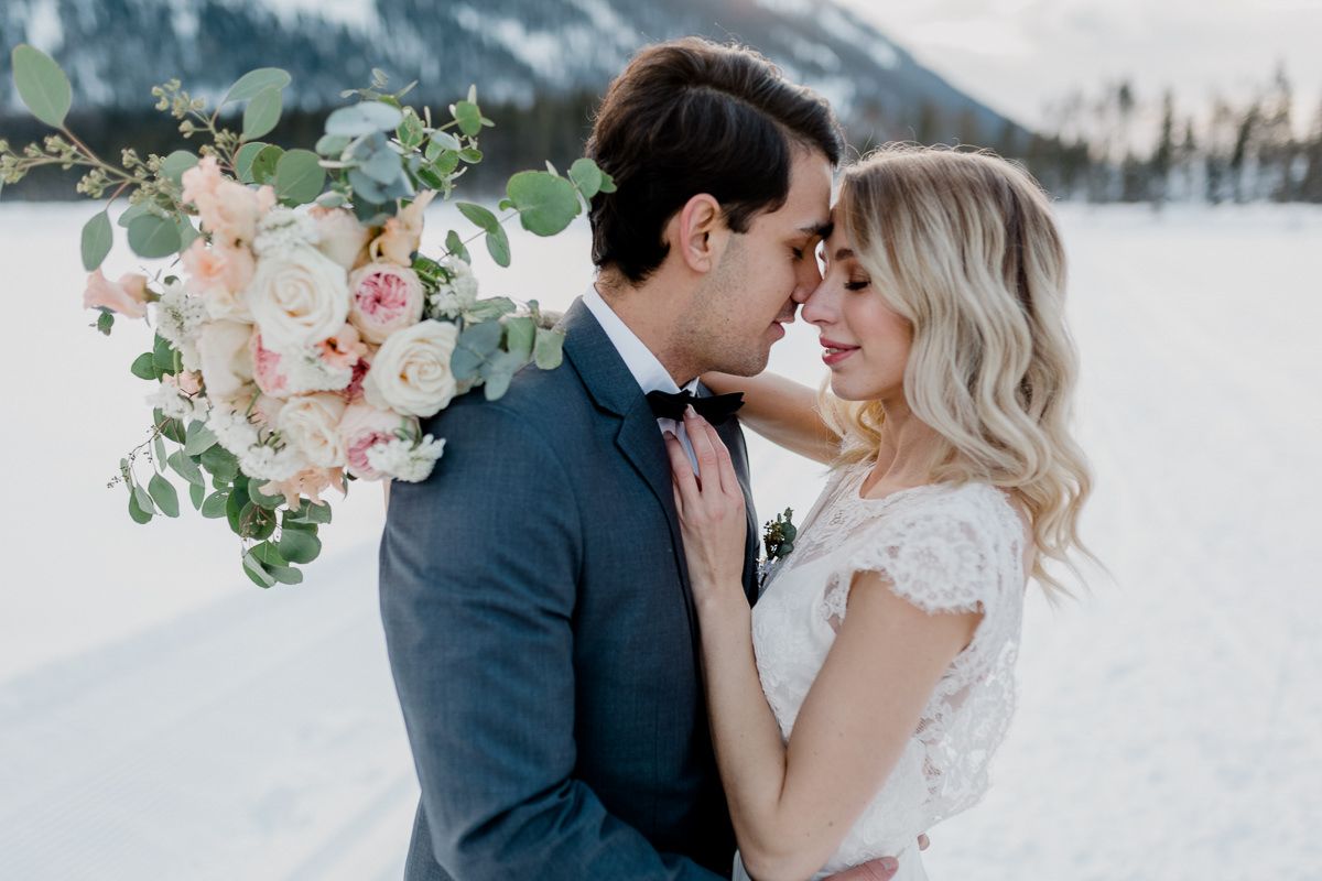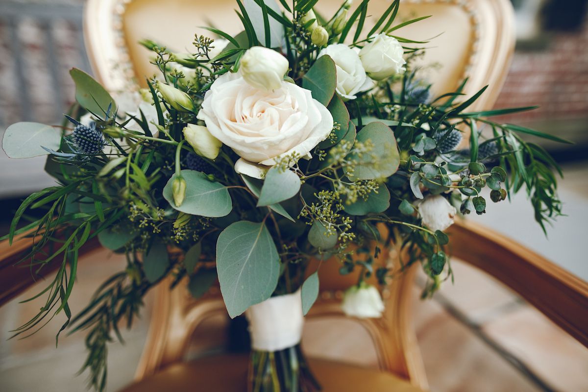 Für einen altrosa Brautstrauß eignen sich ausgezeichnet klassische Rosen oder Pfingstrosen, sie unterstreichen den eleganten Stil eines Hochzeitsstraußes in dieser Farbe. Kombiniert mit Eukalyptus, lassen sie sich außerdem zu einem Strauß im trendigen Vintage-Stil binden.