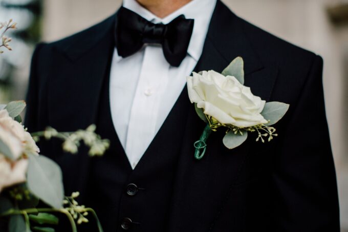 Fliege und Ansteckblume runden den eleganten Look ab.