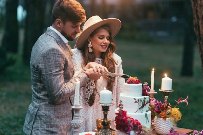 In der Regel haltet Ihr als Paar eine kurze Ansprache, in der Ihr allen Gästen dankt, dass sie erschienen sind. Anschließend schneidet Ihr die Torte gemeinsam an. Ihr müsst zunächst nur ein Stück abschneiden, das Ihr auf einen Teller legt und gemeinsam probiert.