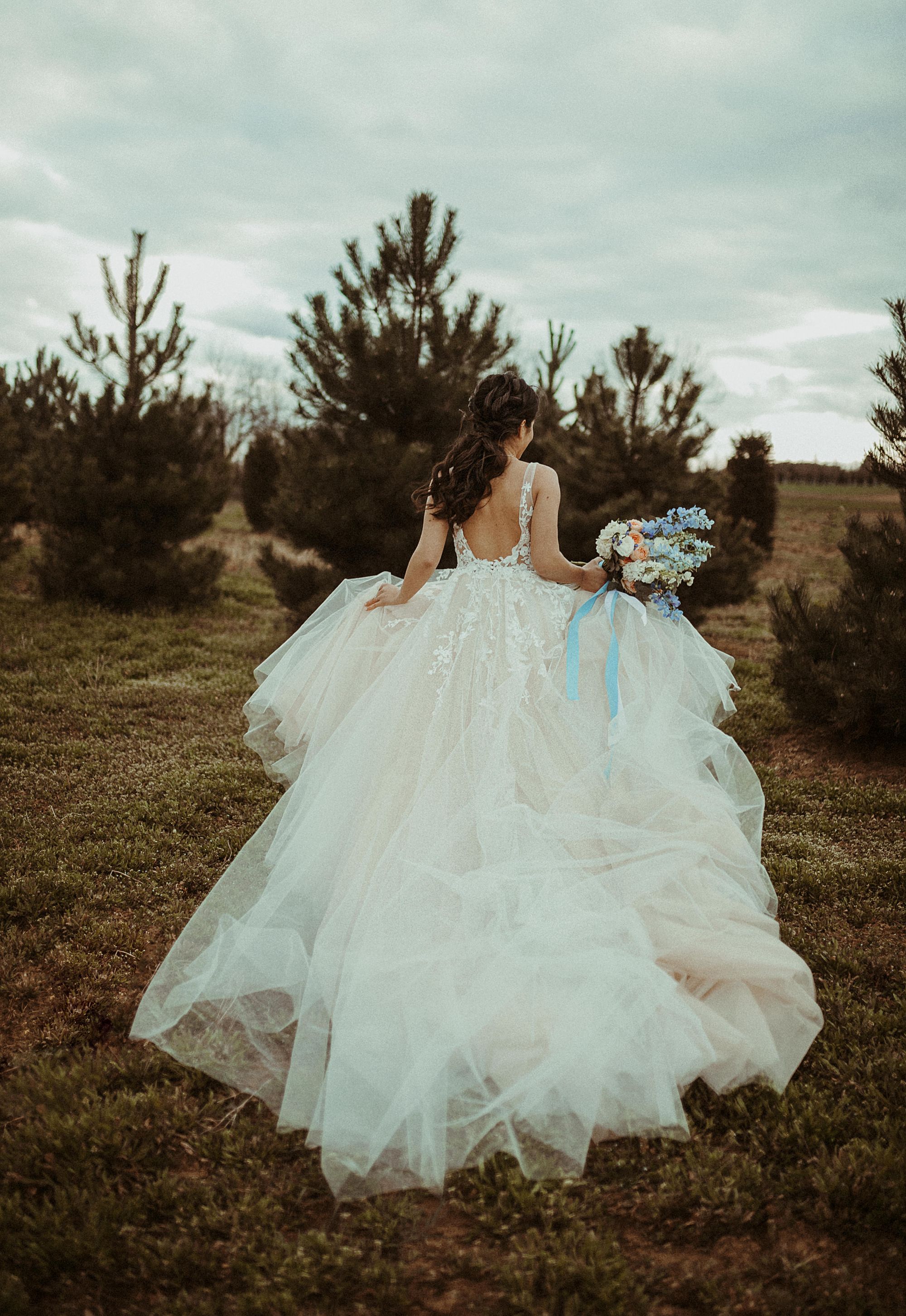 Der wallende Tüllrock des Brautkleids kommt erst richtig zur Geltung, wenn es von der Braut getragen wird und lässt es wie ein wahrhaftiges Prinzessinnenkleid aussehen! Die Frisur der Braut wirkt romantisch und verspielt zugleich. Hier hat die Stylistin einen tiefen Zopf mit groben Flechtdetails gezaubert, die den Brautlook wunderbar abrunden.