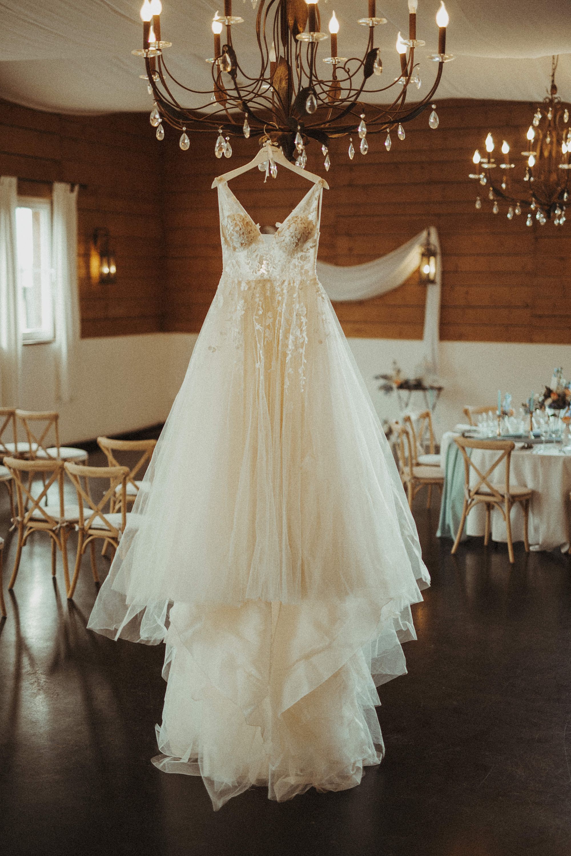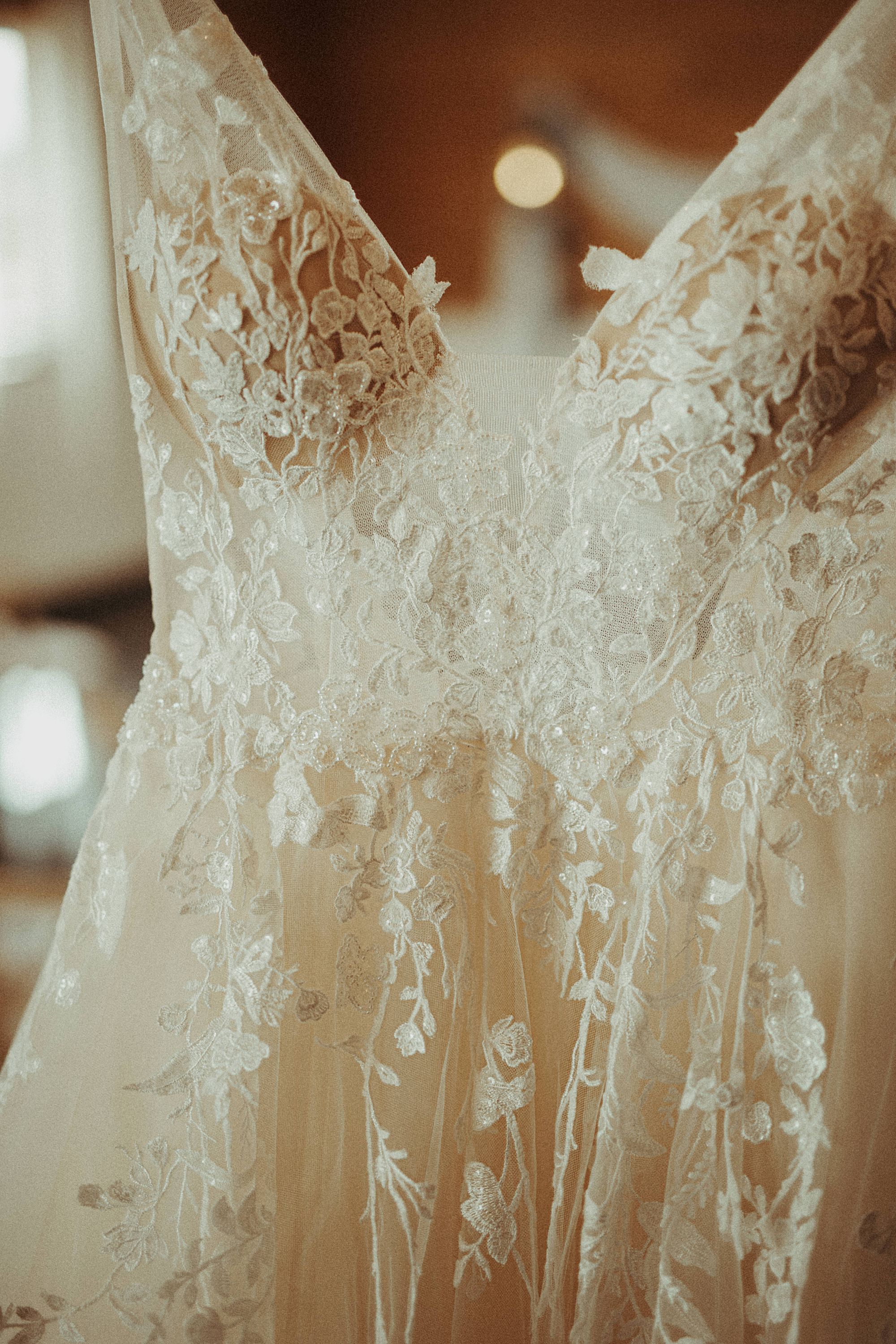 Das Brautkleid ist ein Traum aus Tüll und schmeichelt durch seine A-Linie jeder Figur. Das Kleid bekommt durch verspielte Spitzendetails einen romantischen Look und wirkt durch seinen tieferen Ausschnitt alles andere als bieder, sondern zaubert dazu noch ein wunderschönes Dekolleté.