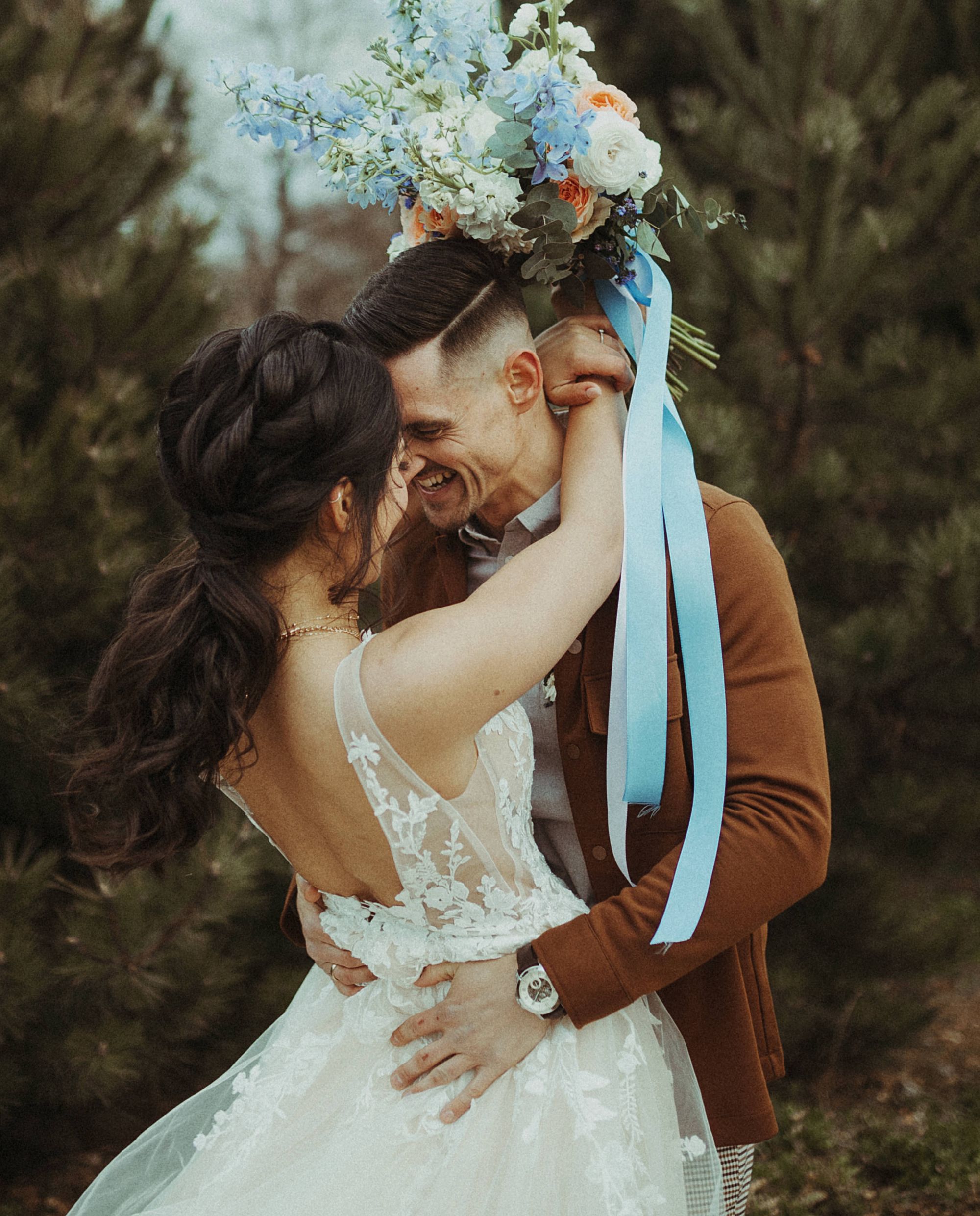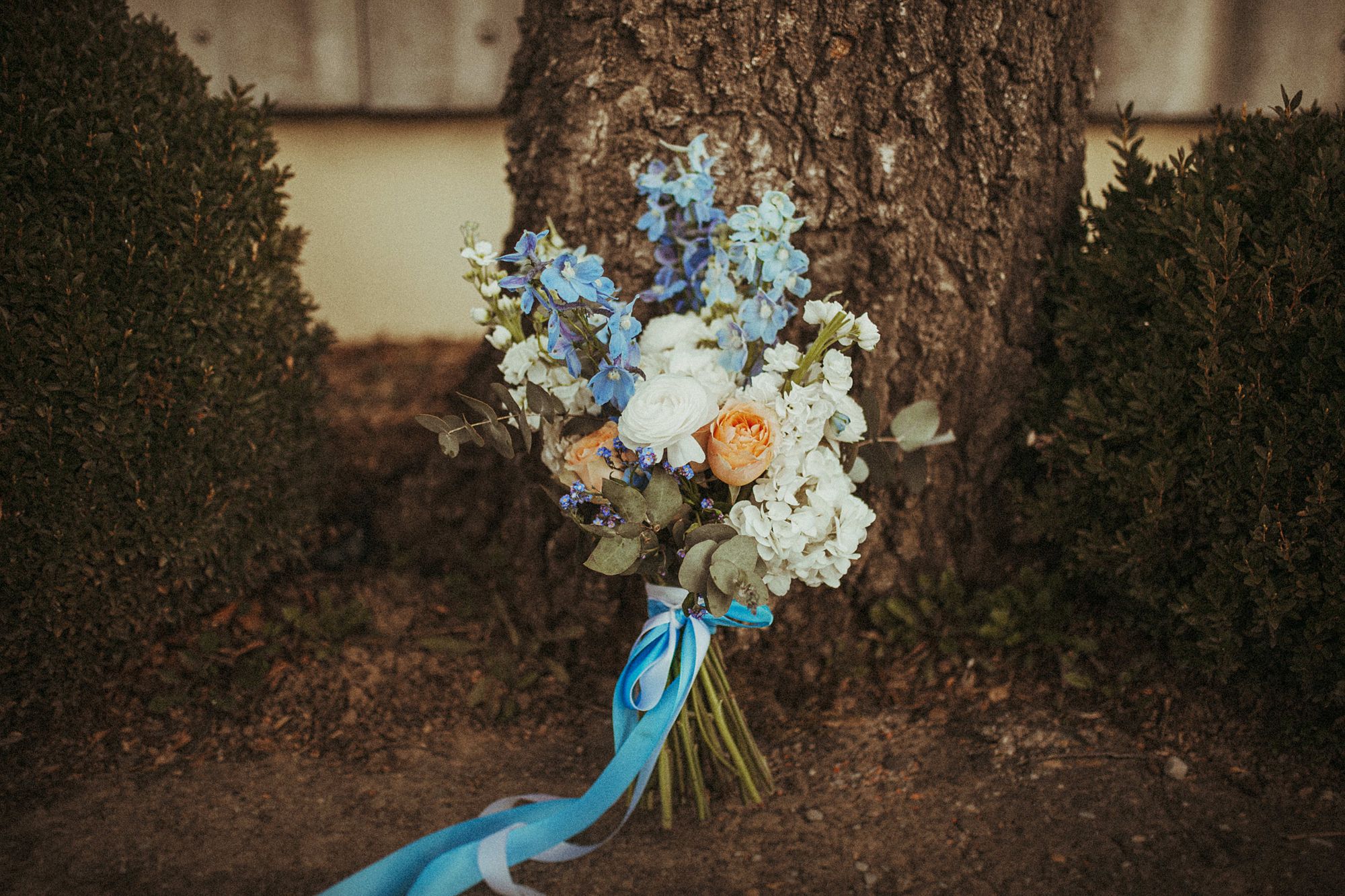 Der Brautstrauß wurde ähnlich wie die Blumendekoration in der Location in weiß, peach und blau gestaltet. Ein tolles Detail sind die langen Satinbänder in blau und weiß, die für einen zusätzlichen Farbtupfer bei dem Brautlook sorgen.
