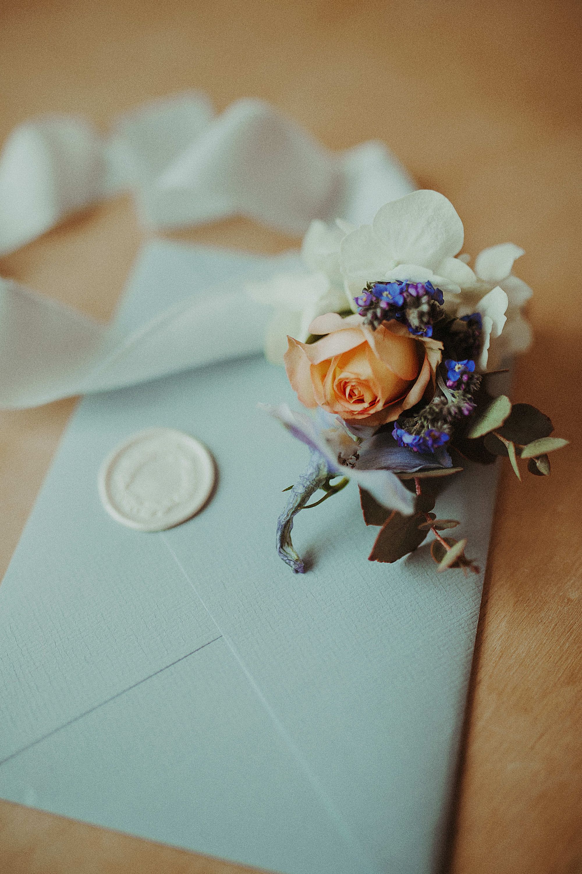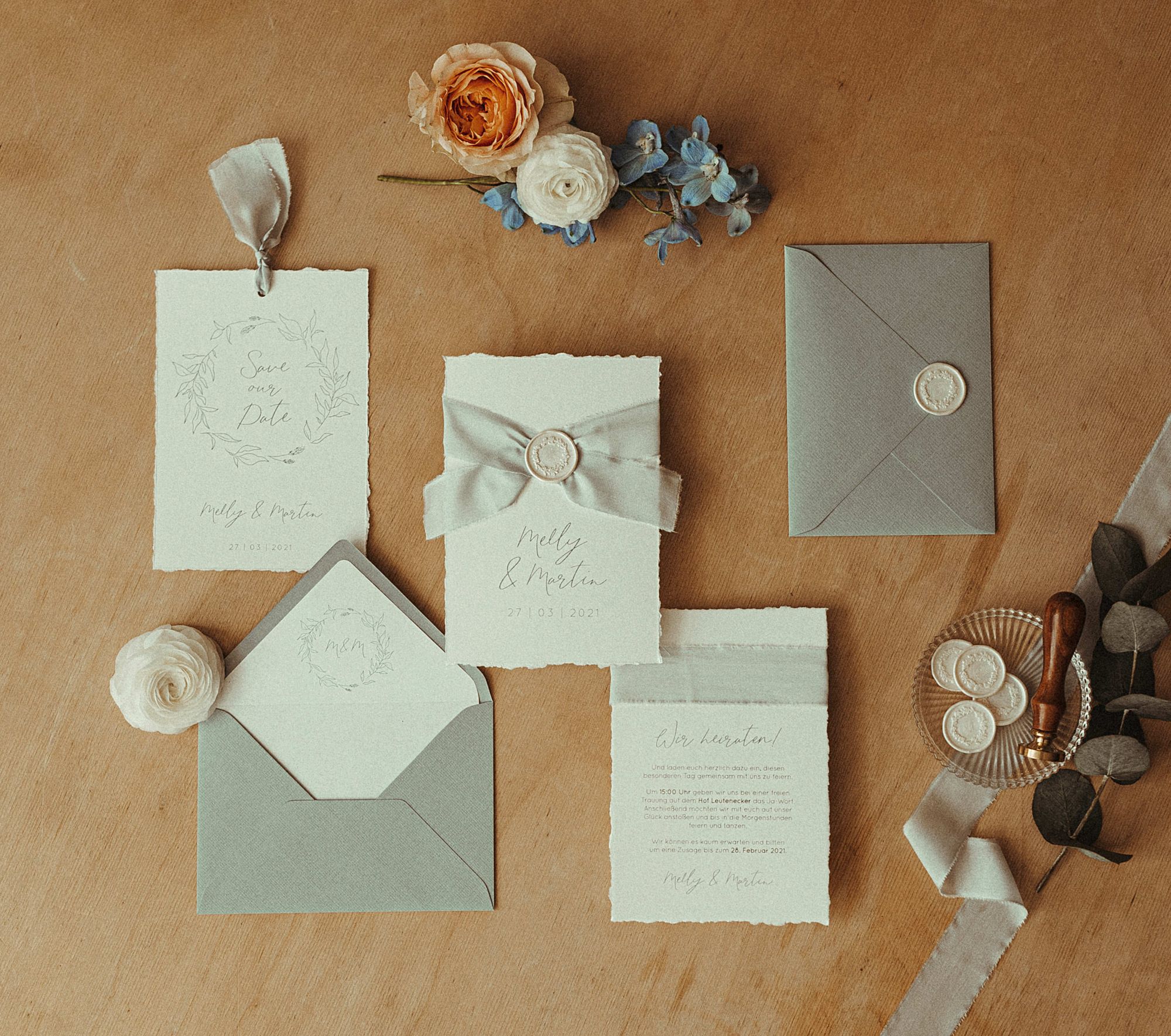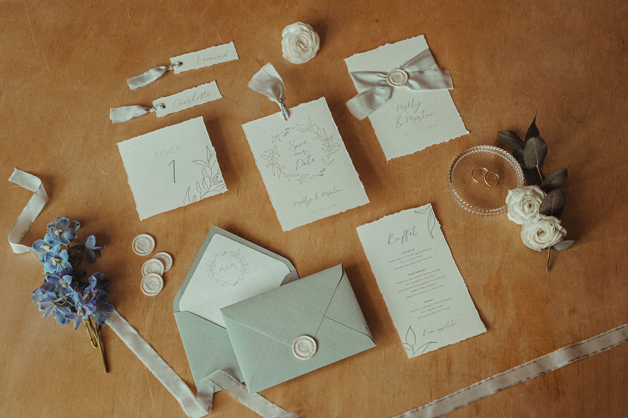 Das Shooting überzeugt nicht nur durch sein wunderbares Farbmotto, sondern auch durch seinen romantischen und verspielten Look. Dieser zieht sich ebenfalls durch die passende Papeterie, die sehr elegant gestaltet wurde. Die Kalligraphie-Elemente geben schon einen Vorgeschmack auf den romantischen Stil des Shootings und sind hier besonders kunstvoll. Blättermotive runden den Look wunderbar ab und allein der Briefumschlag und die Satinbänder geben einen Vorgeschmack auf das Farbmotto.
