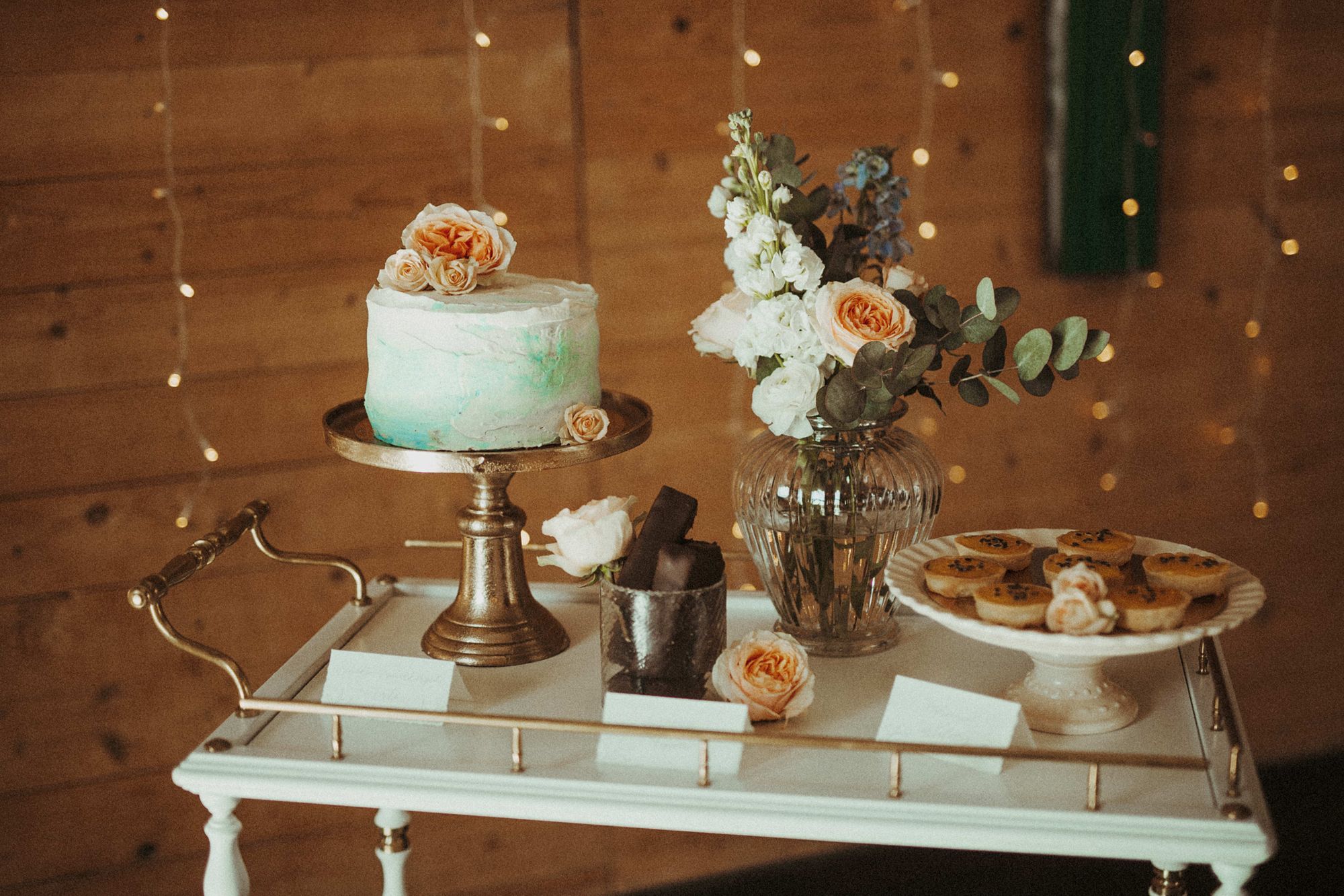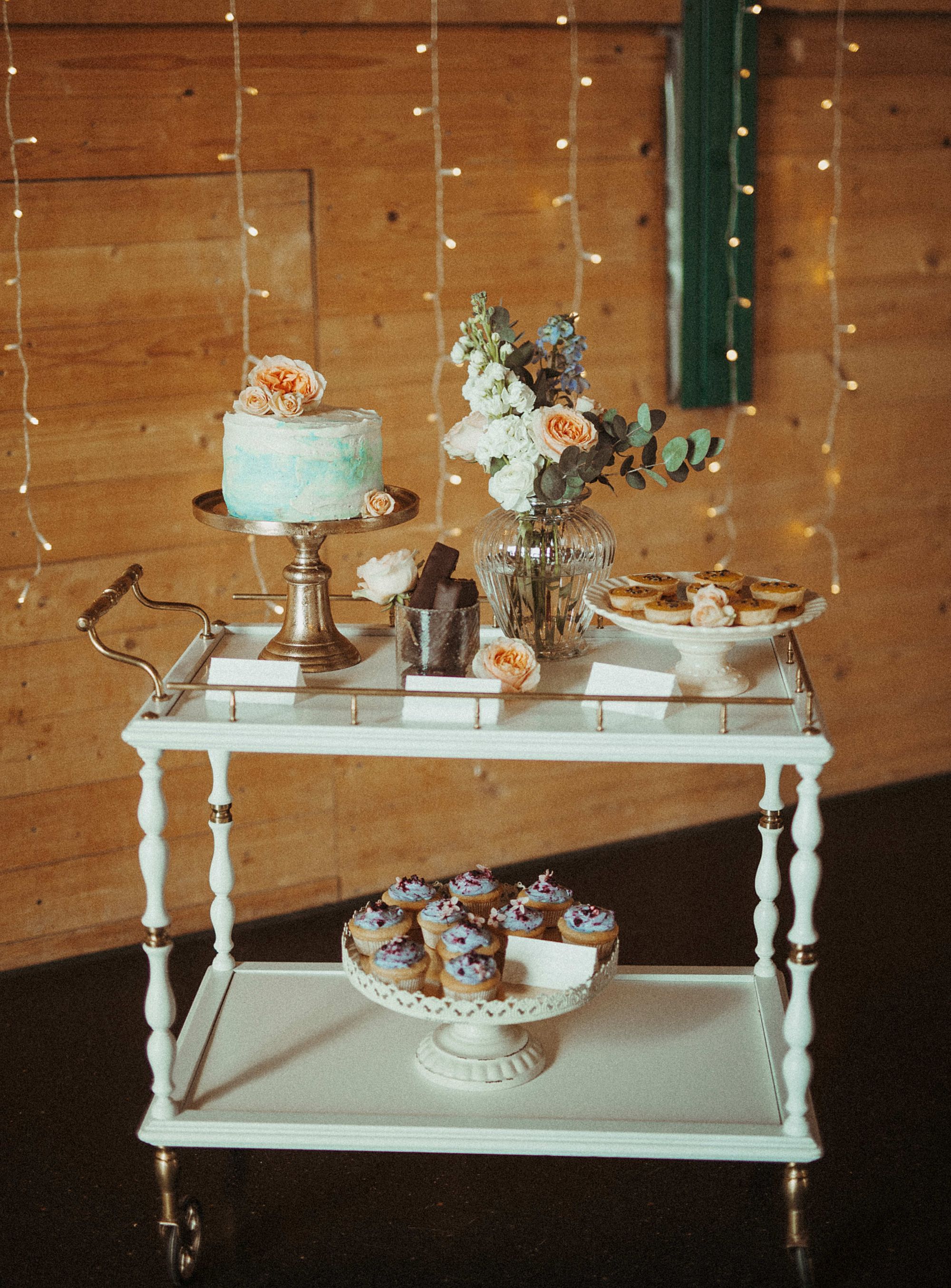 Der Sweet Table ist natürlich passend zum Shooting-Motto gestaltet und auch mit einem kleinen Blumenstrauß in den Farben peach, blau und weiß ausgestattet. Die einstöckige Hochzeitstorte ist zusätzlich mit einzelnen peachfarbenen Rosen dekoriert und sieht dadurch besonders ansprechend aus. Ganz toll finden wir auch die einzelnen blaugrünen Farbakzente in der Creme der Torte! Neben der Torte können sich die Gäste auch an Cupcakes und an derem Gebäck bedienen, die sehr ansprechend auf dem Dessertwagen drapiert wurden.