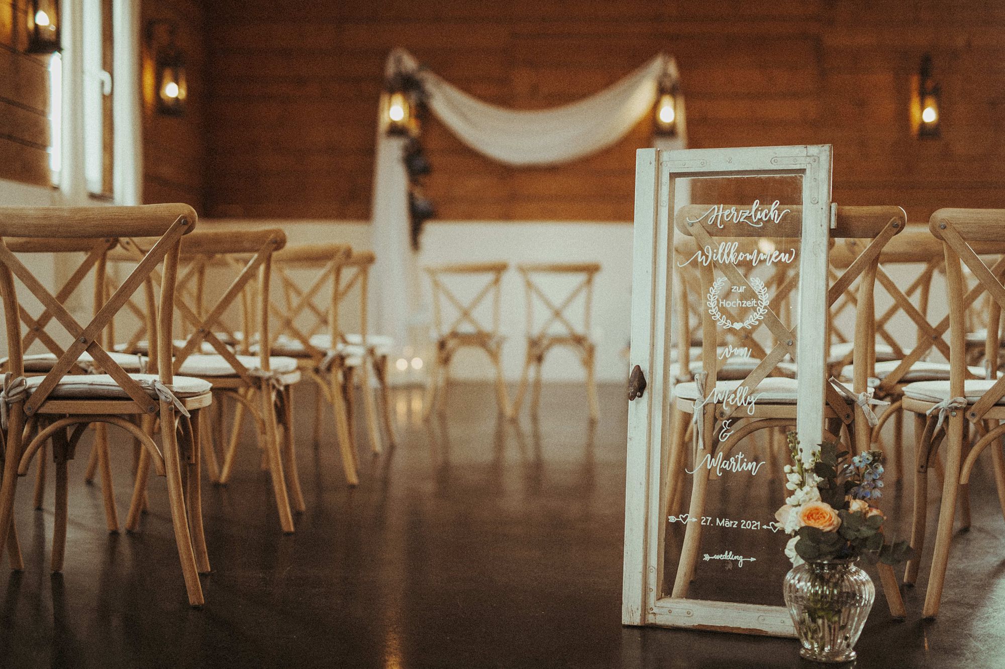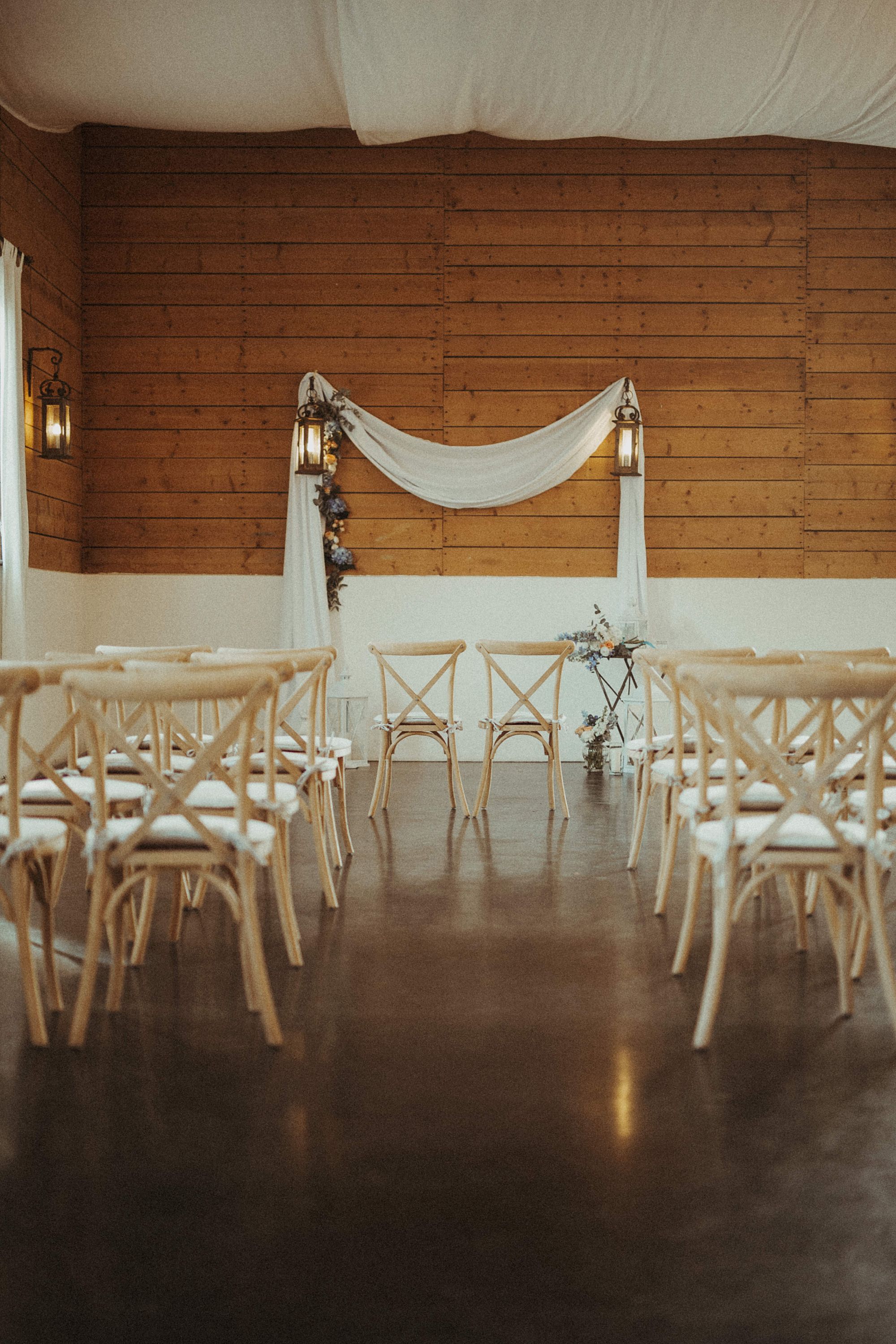 Die Trauzeremonie wurde hier für den Innenbereich vorbereitet, sodass die Hochzeitsgesellschaft es auch bei schlechtem Wetter warm und trocken hat. Statt eines Traubogens wurde dieser an der Wand mit einem langen, weißen Tuch nachempfunden, das über zwei Haken drapiert wurde. An diesen und anderen Haken wurden Laternen gehängt, die wunderbar für romantische Stimmung in der Traulocation sorgen.
