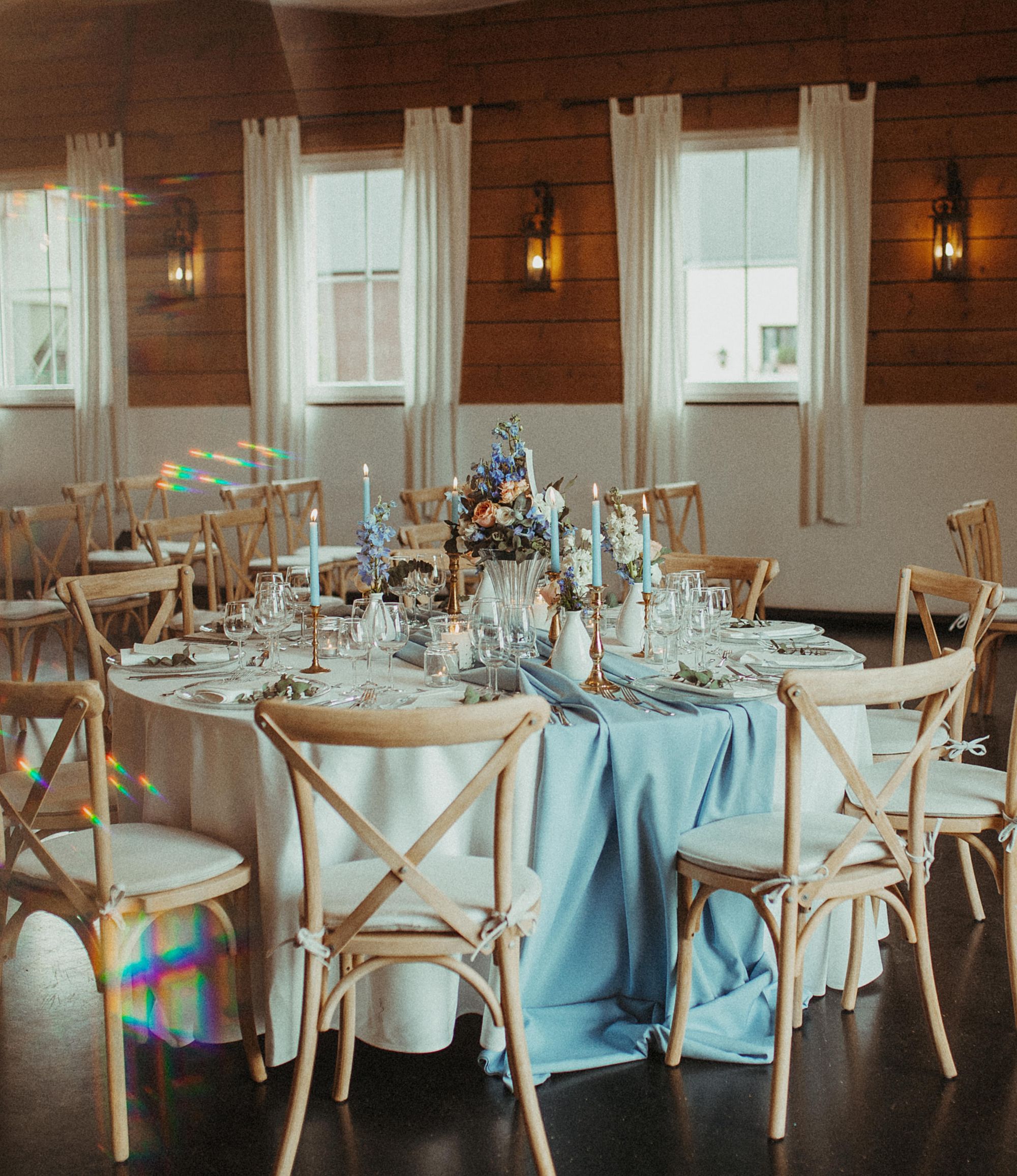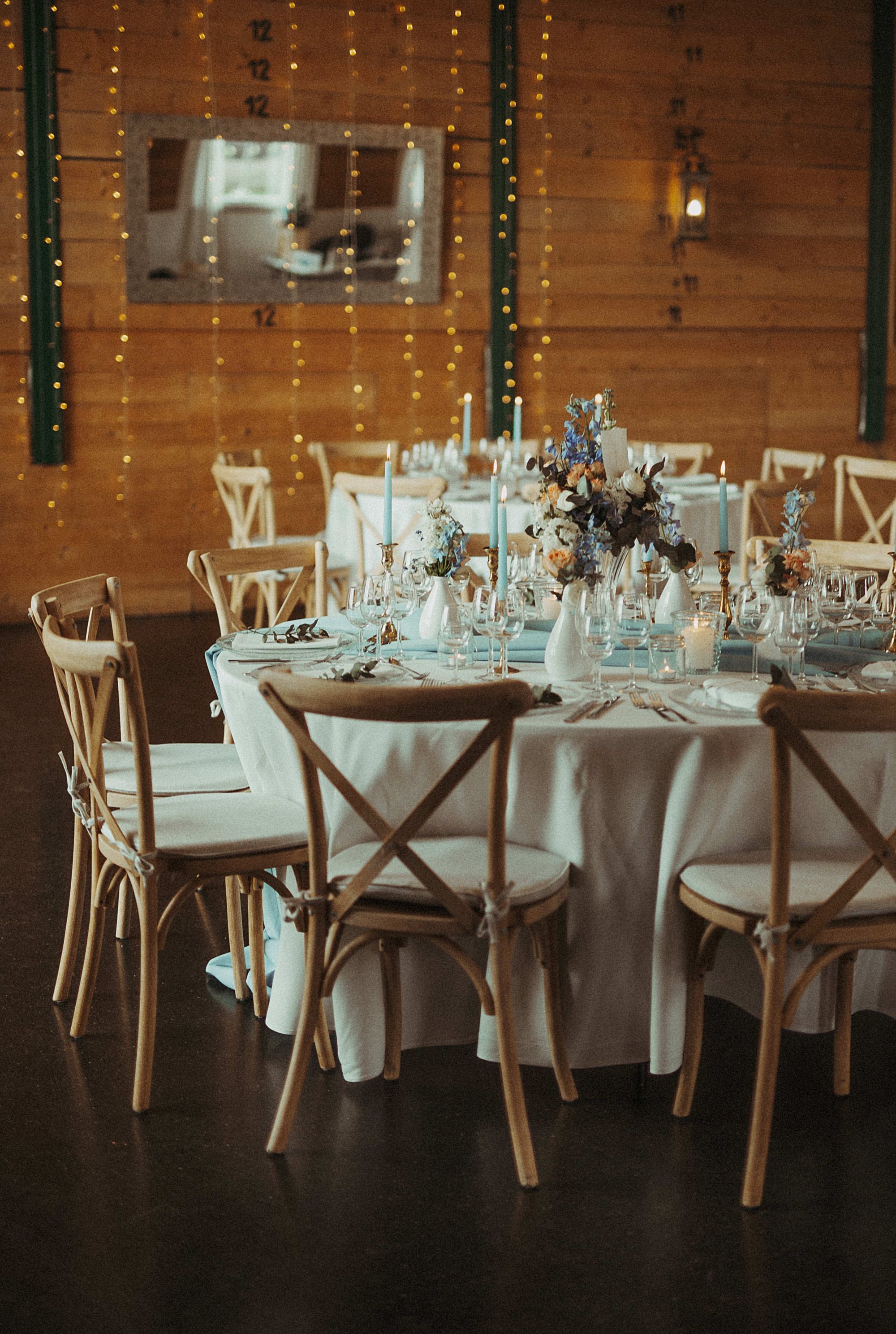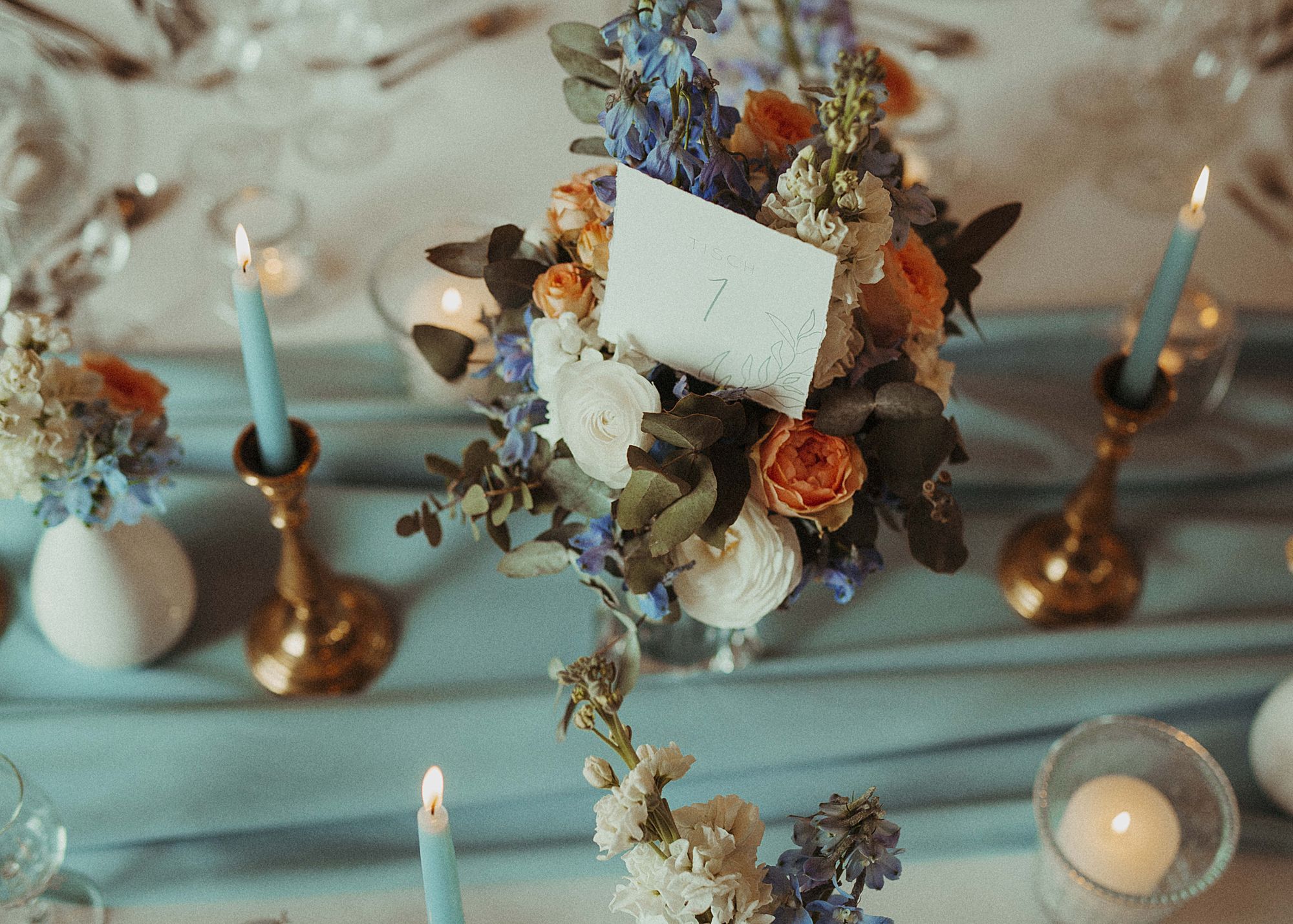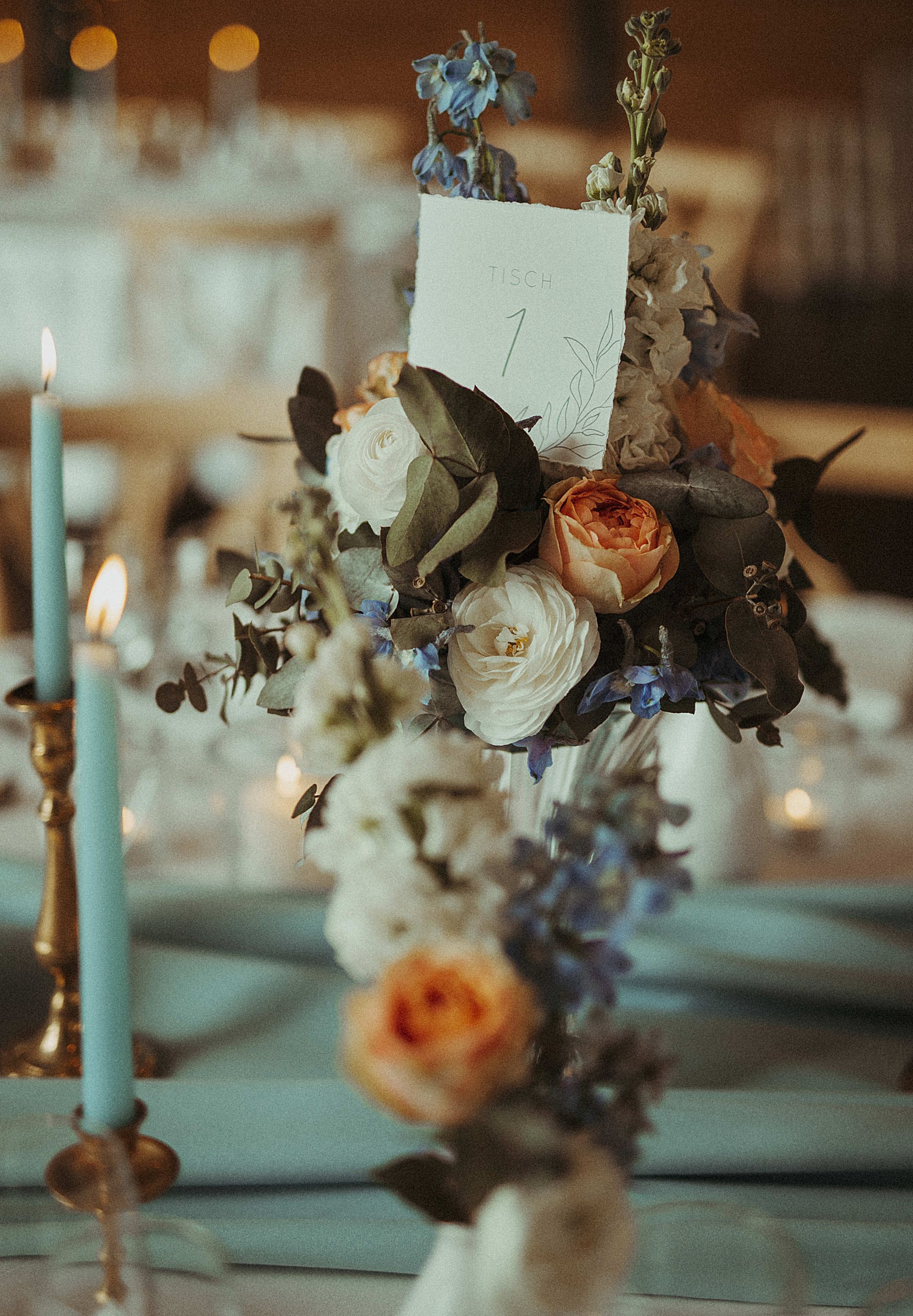 Die Tische in dem Saal des Leuteneckerhofs wurden mit weißen Tischdecken ausgelegt, auf denen mittig ein hellblaues Tischtuch drapiert wurde. Passend zu dem Farbmotto sind auch Kerzen in dem gleichen Blauton auf den Hochzeitstischen zu finden, die zu späterer Stunde die Location in wunderschönes Licht tauchen. Auch wenn das Farbmotto sehr bunt klingt, so wurde hier gekonnt mit Details und einzelnen Farbakzenten gespielt, die die Hochzeitstische weder zu überladen noch zu kitschig wirken lassen.