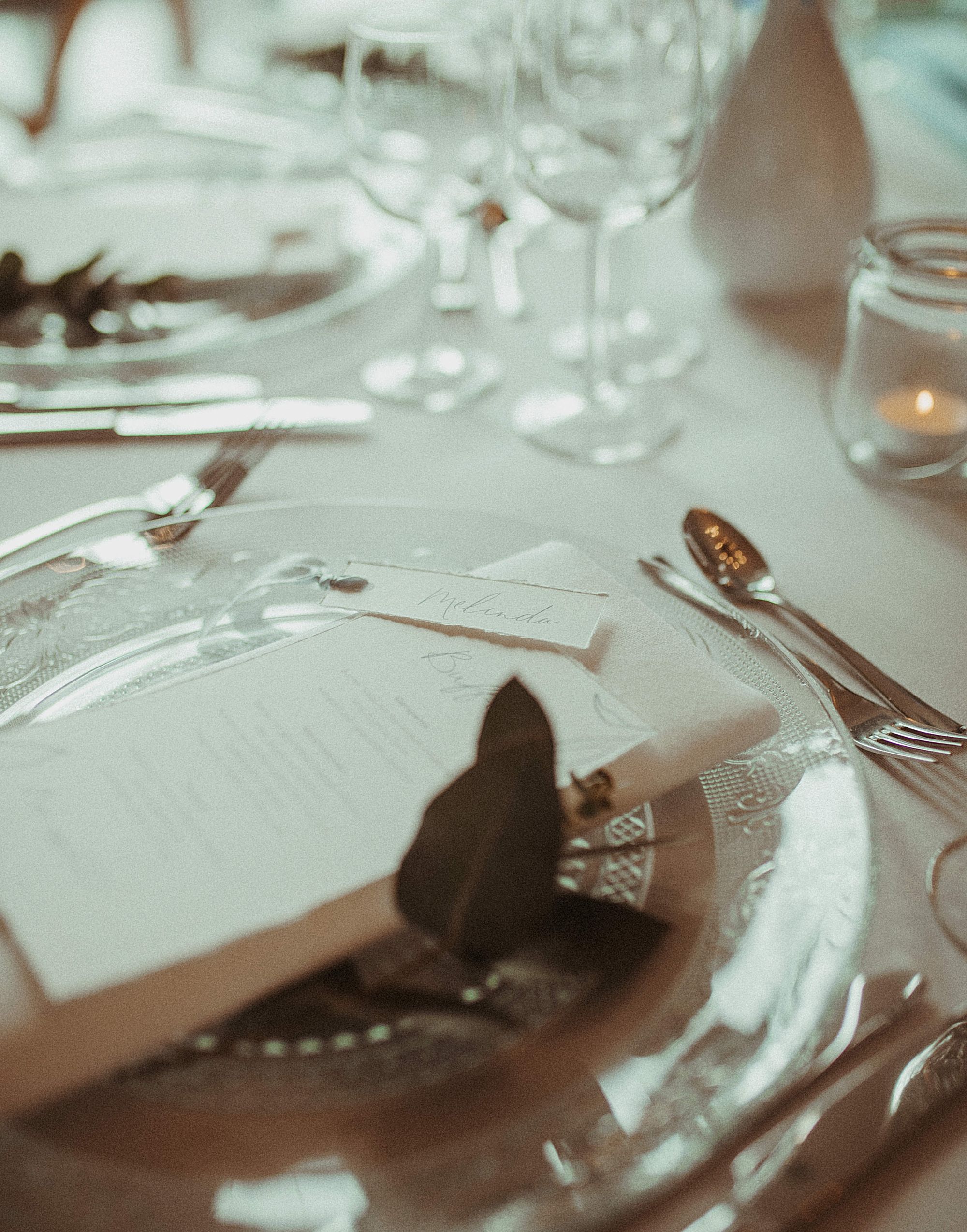Als Service wurde hier ein klassisches Porzellangeschirr gewählt, das zu nahezu jedem Farb- und Hochzeitsmotto passt. Jedem Gast wurde schon eine elegante Menükarte auf den Teller gelegt, die sicherlich für Vorfreude auf das kommende Essen sorgt. Dazu einheitlich gestaltet wurden hier die Tischkärtchen, die sehr schön in der Blumendekoration drapiert wurden.