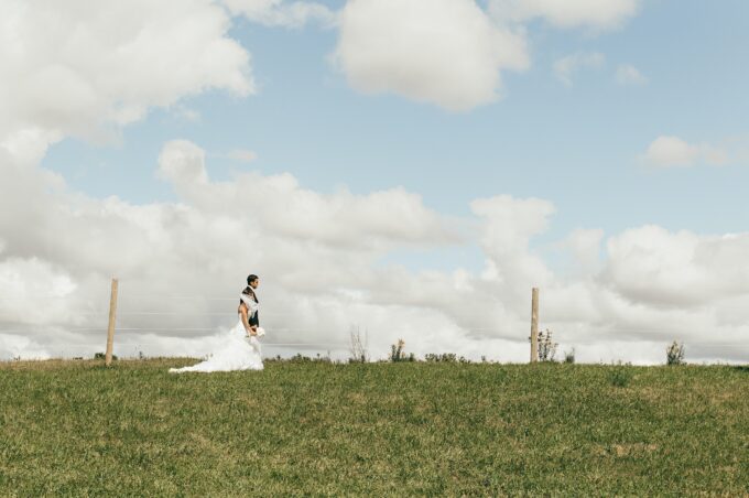Insbesondere für die Braut ist ein für die Landhochzeit passendes Styling nicht wegzudenken. Ein leicht fallendes Brautkleid im Vintage-Stil mit zarter Spitze, ein Blumenkranz aus Wildblumen fürs Haar und ein passender Brautstrauß wirken elfenhaft und treffen das Motto Scheunenhochzeit perfekt.