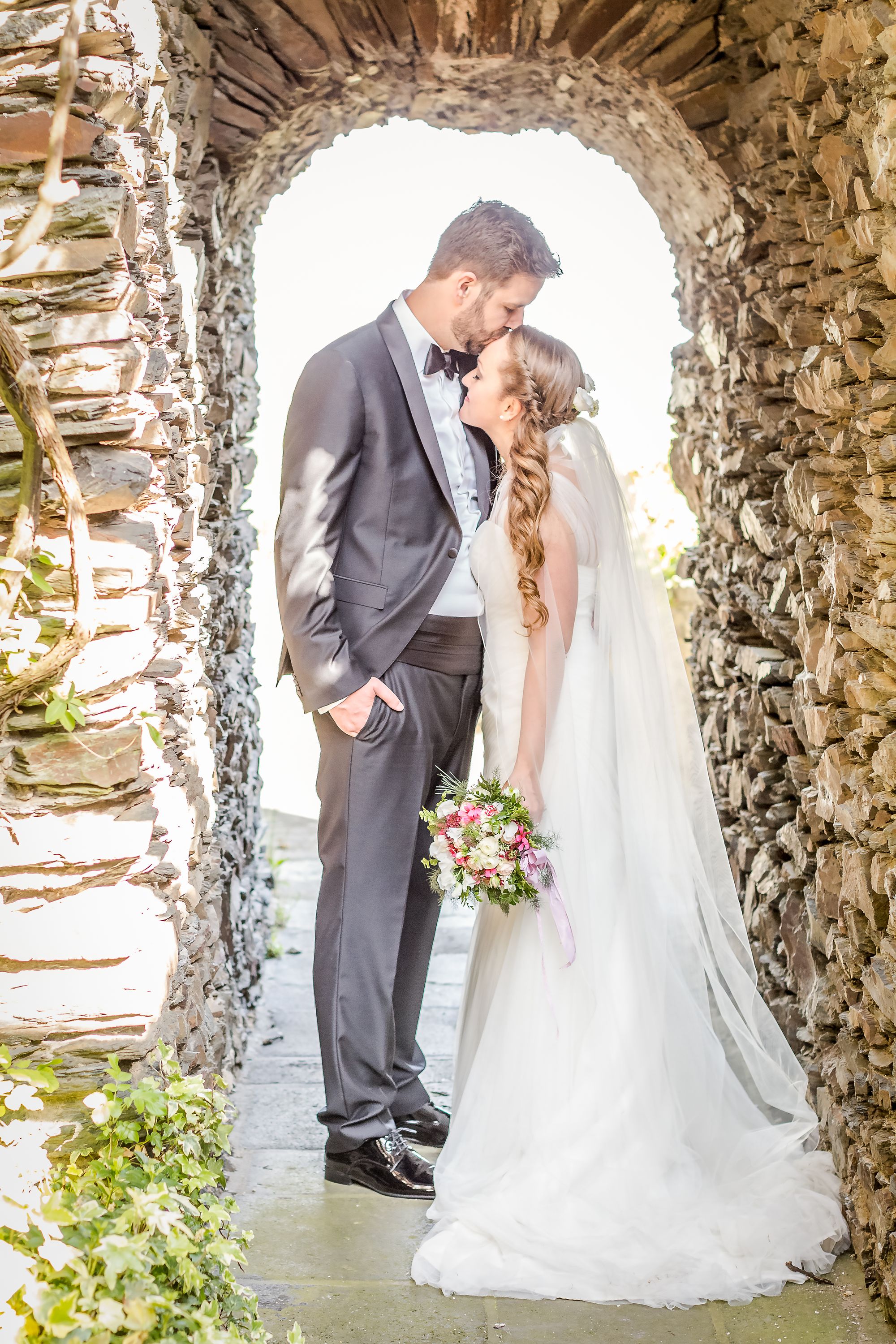 Die kirchliche Trauung konnte aufgrund eines kleinen Details sogar unter freiem Himmel stattfinden: Früher stand an dieser Stelle eine kleine Kapelle und obwohl diese nicht mehr dort steht, ist der Boden immer noch geweiht. Eine schöne Möglichkeit, auch unter freiem Himmel den göttlichen Segen zu erhalten. Die atemberaubende Kulisse der Burg hat die Fotografin Simone Kellner genutzt, um wunderschöne Hochzeitsbilder zu schießen. Lasst Euch verzaubern.